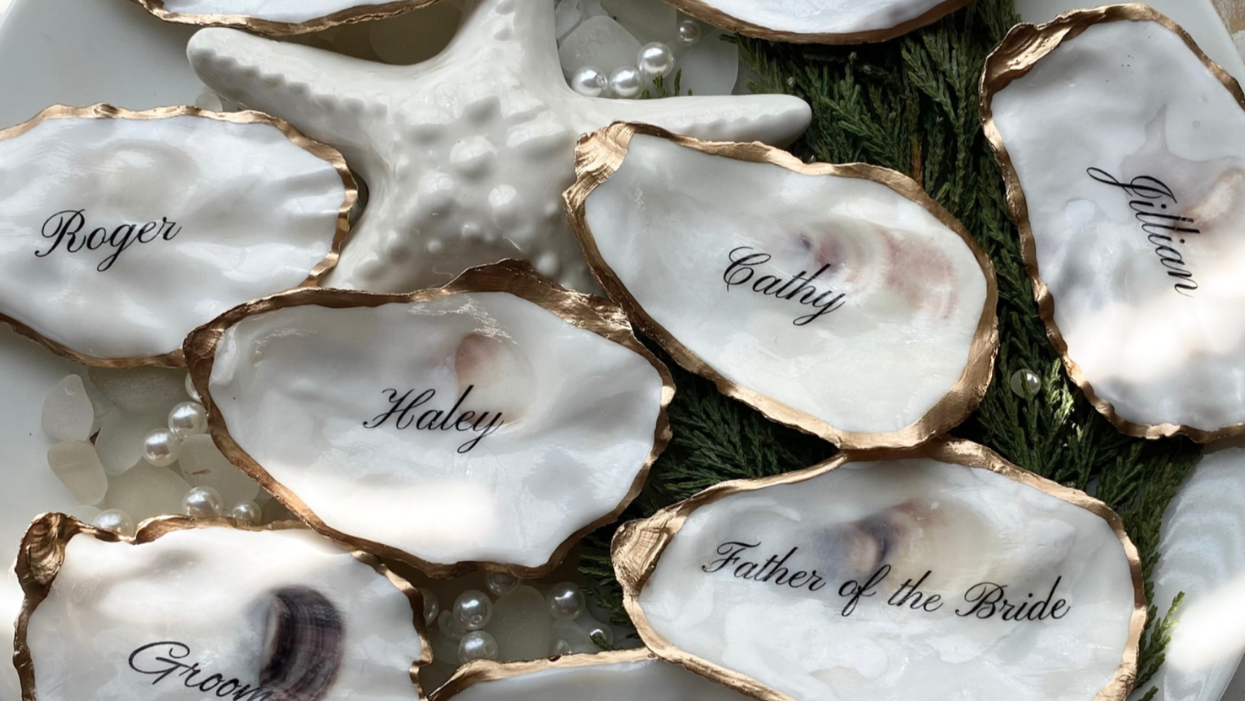 Oyster Escort Collection featuring luxury oyster shell escort cards and place cards...
