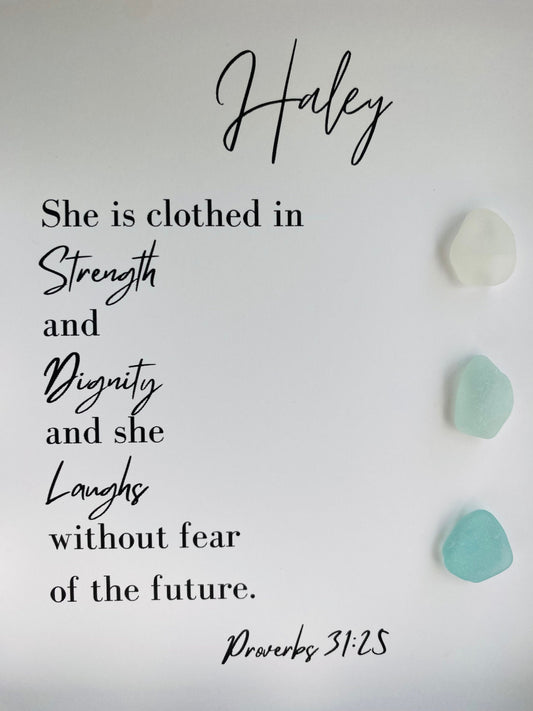 Religious Gift | Personalized Friend Gift | Sea Glass Poem | Proverbs 31:25 | Inspirational Scripture Sign Wall Art | Birthday Gift for Friend | Unique Pebble Art | Gift for Pastor or Priest