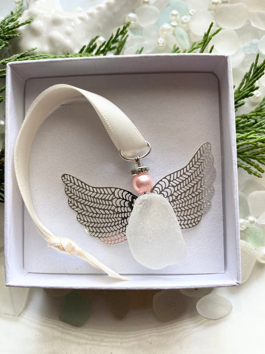 Sea Glass Ornament Angel Ornaments Sea Glass Art Christmas Gift for her Angel Gift Ornaments Angel Wings Gift Box Angel Handmade Gift F