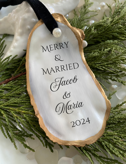 Merry and Married 2025 Christmas Ornament – Handmade Oyster Shell Wedding Ornament for Newlyweds. Celebrate your First Christmas as a Married Couple with this Nautical Coastal Tree Ornament.