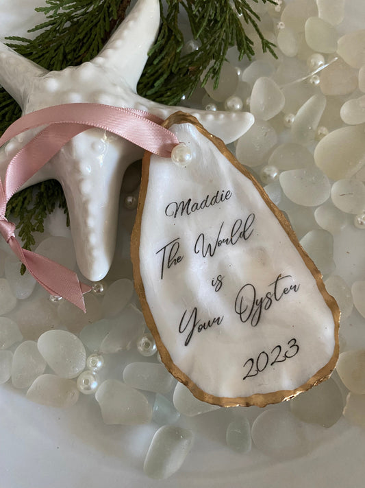 Personalized Oyster Shell Ornament 2024 The World is Your Oyster 2024 Christmas Ornament Coastal Christmas Decor Custom Oyster Shell Ornament Handmade Christmas Keepsake Gold Gilded Oyster Shell