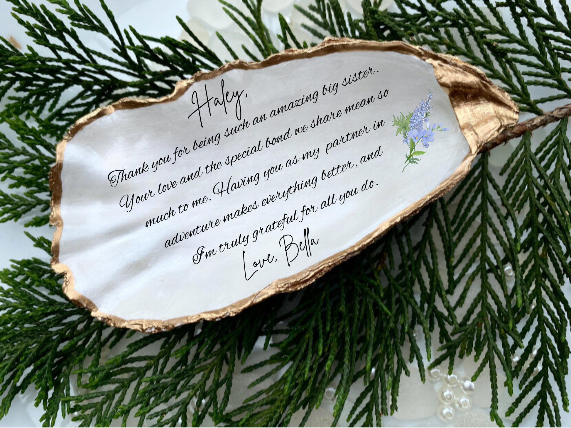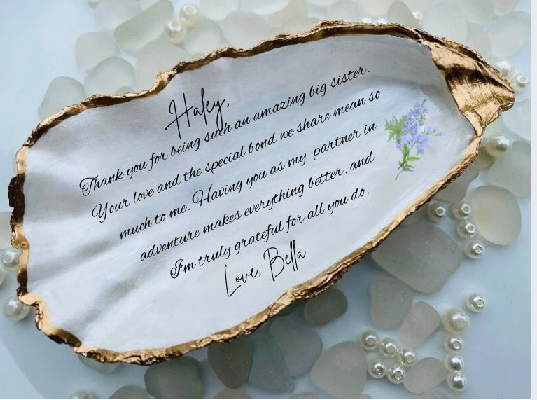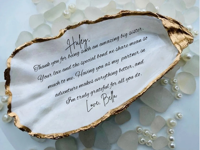 A Unique, Handcrafted Gift for Your Beloved Big Sister. Surprise your amazing big sister with a unique, handcrafted oyster shell ring dish, perfect for Christmas, her birthday, or any special occasion. Featuring a beautiful pearl-painted finish and elegant gold leaf trim, this one-of-a-kind jewelry dish is a meaningful, personalized keepsake that celebrates the special bond you share. Each ring dish can be customized with a special quote or memorable date, creating a truly thoughtful gift for sister that reflects the cherished memories between you. Carefully gift-boxed and ready to bring a smile, this handmade gift is a beautiful way to show her just how much she’s loved.