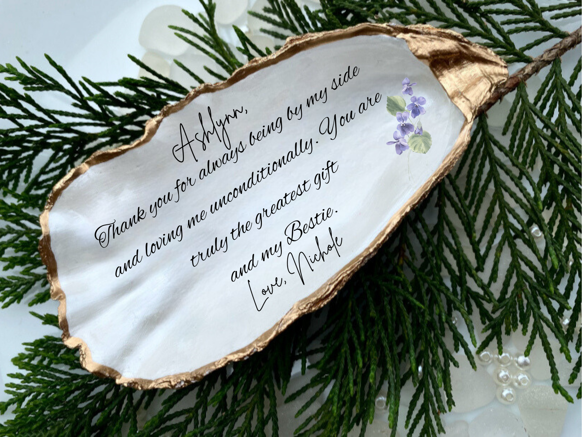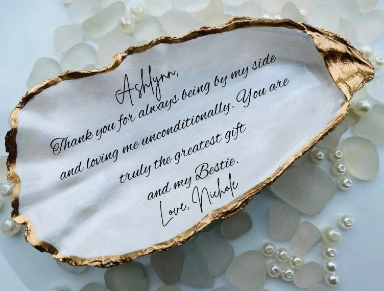Surprise your best friend with a unique, handcrafted oyster shell ring dish, featuring a beautiful pearl-painted finish and elegant gold leaf trim. This personalized keepsake is perfect for celebrating a friendship that’s like no other, with the option to add a custom quote or special date that’s meaningful to both of you. It’s gift-boxed and ready to bring a smile, whether it’s for a birthday, special celebration, or simply because!