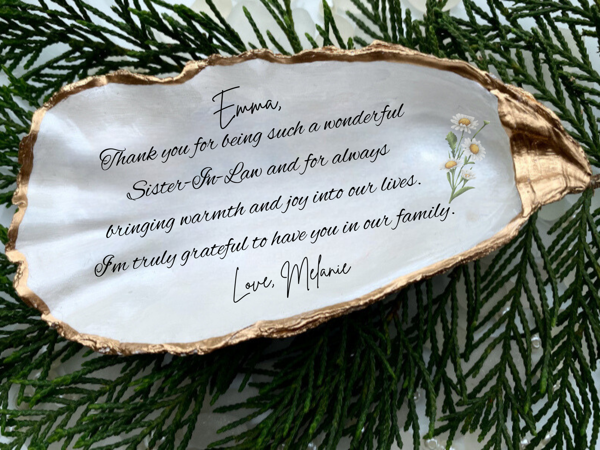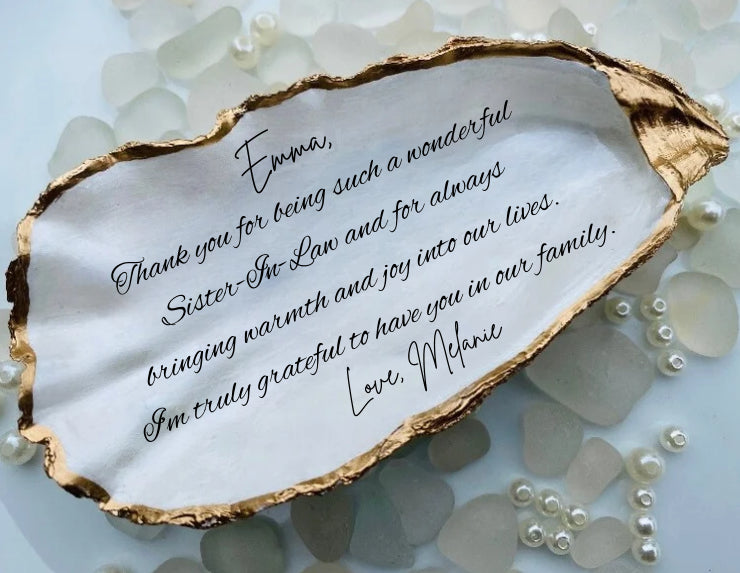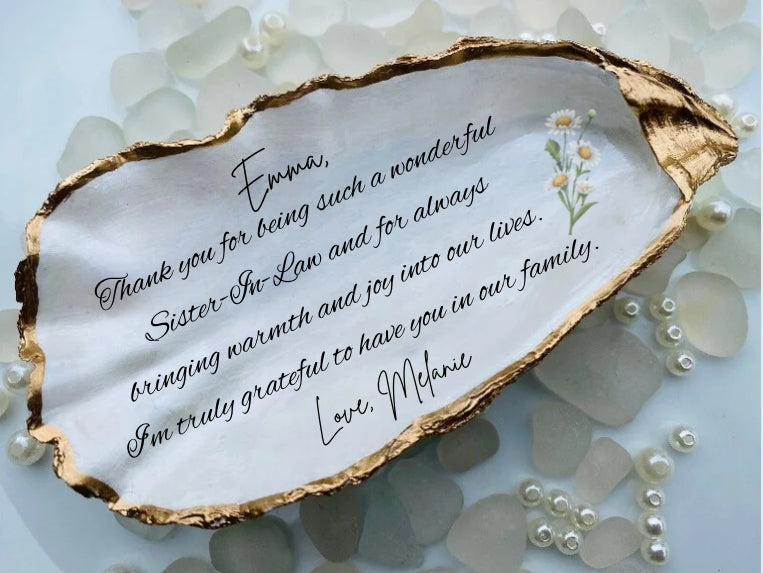 A Unique, Handcrafted Gift for Your Wonderful Sister-in-Law. Surprise your amazing sister-in-law with a unique, handcrafted oyster shell ring dish, perfect for Christmas, her birthday, or any special occasion. Featuring a beautiful pearl-painted finish and elegant gold leaf trim, this one-of-a-kind jewelry dish is a meaningful, personalized keepsake that celebrates the special bond you share. Each ring dish can be customized with a heartfelt quote or memorable date, creating a truly thoughtful gift that reflects the cherished memories between you. Carefully gift-boxed and ready to bring a smile, this handmade treasure is a beautiful way to show her just how much she’s appreciated.