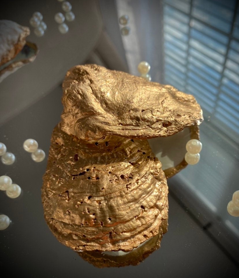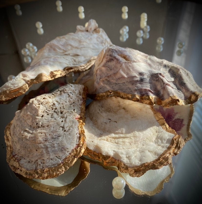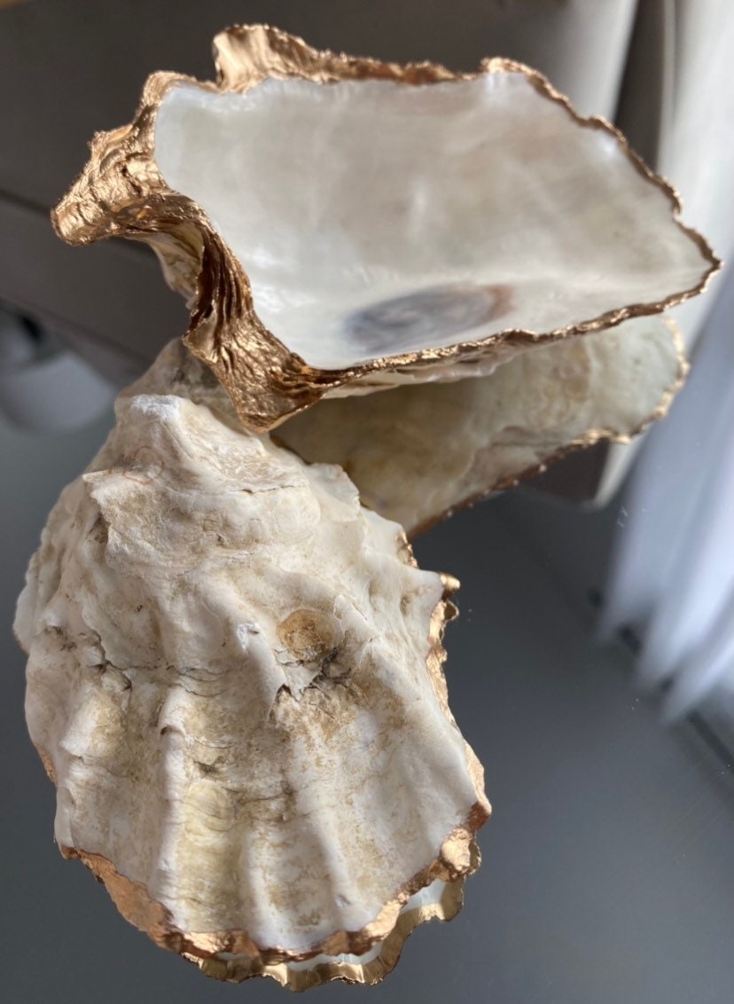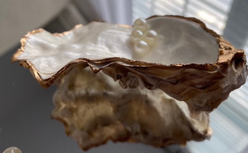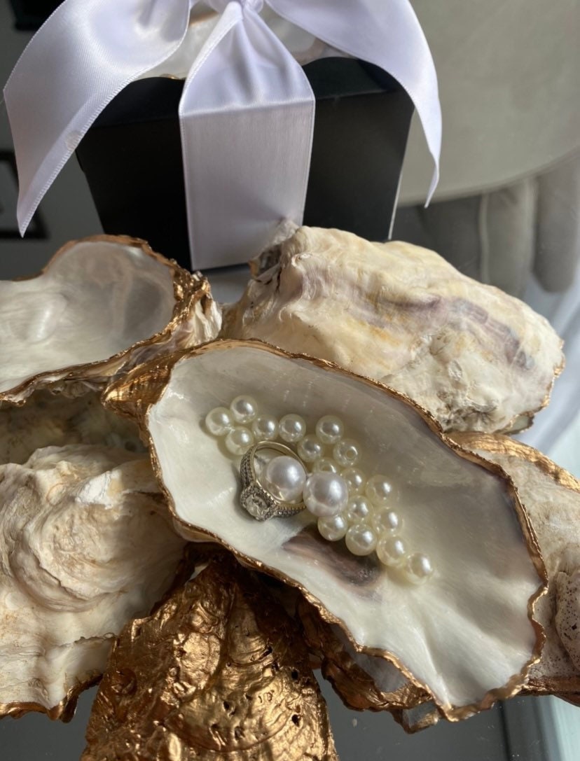 Discover the ultimate handcrafted oyster shell ring dish, featuring a stunning glossy finish and elegant gold leaf trim. This unique piece is an ideal gift for brides, bridal showers, or anyone celebrating a special occasion like a 30th anniversary. It's a thoughtful and functional keepsake that will help her cherish the memories of her big day!