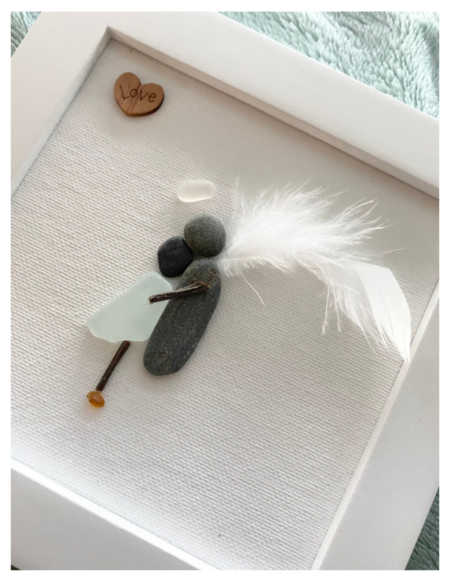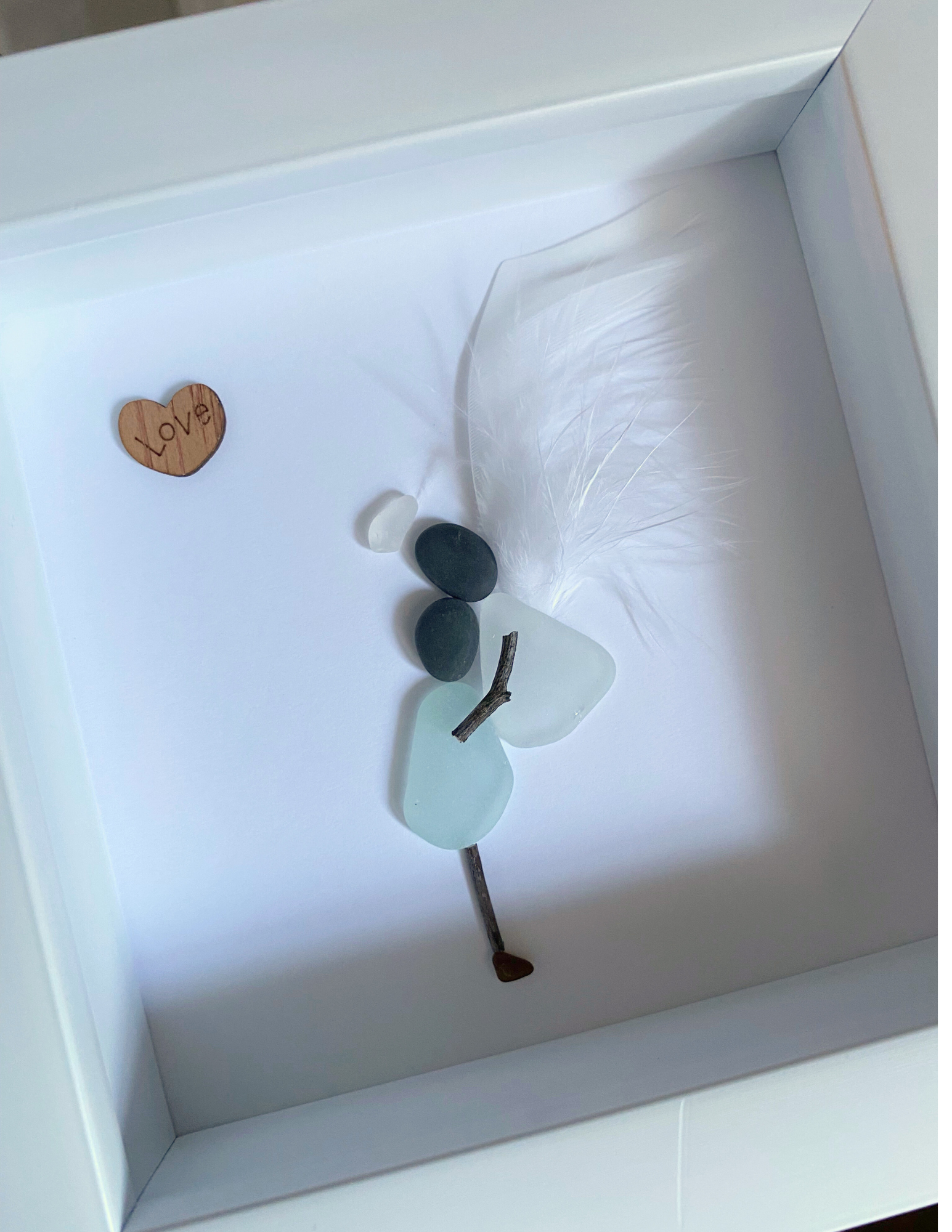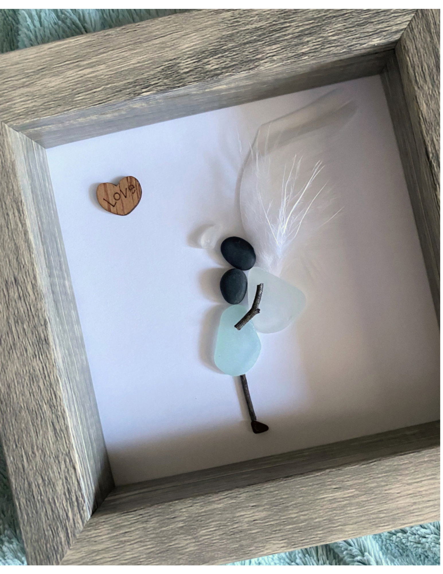 Our personalized sea glass art arrives beautifully packaged in an elegant opaque gift bag, ready for gifting. Each piece is framed in a stylish shadowbox, making it perfect for display on a bookshelf or as a striking hanging wall art addition to any home decor. When personalizing your order, please specify if you prefer Sea Glass Wings or Feather Wings; otherwise, the default will be Feather Wings.