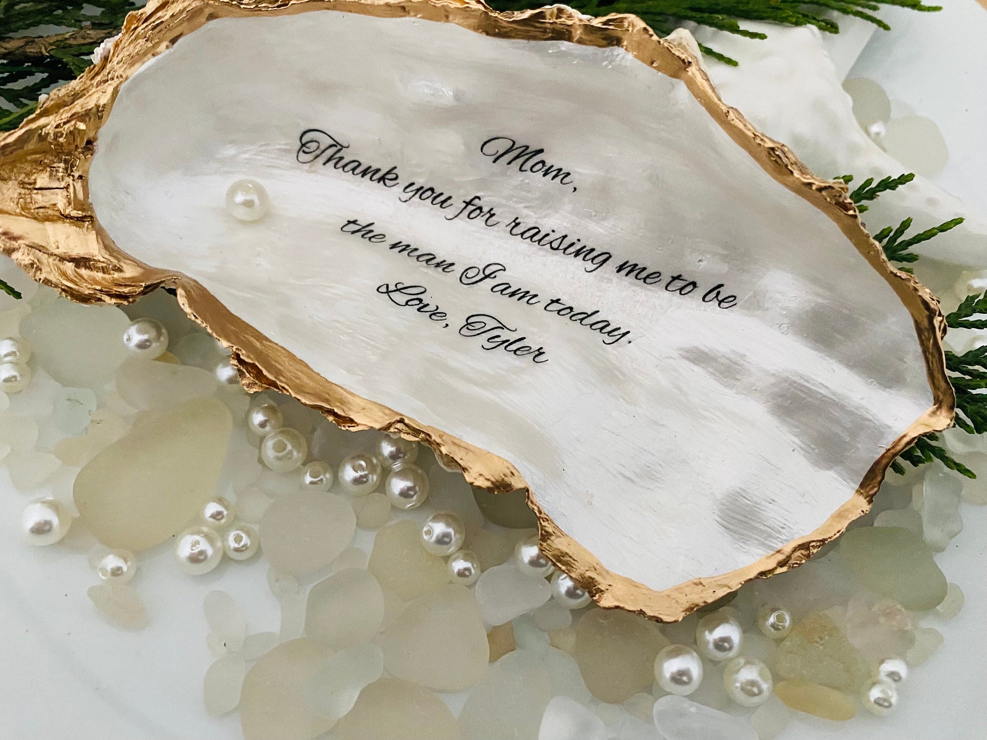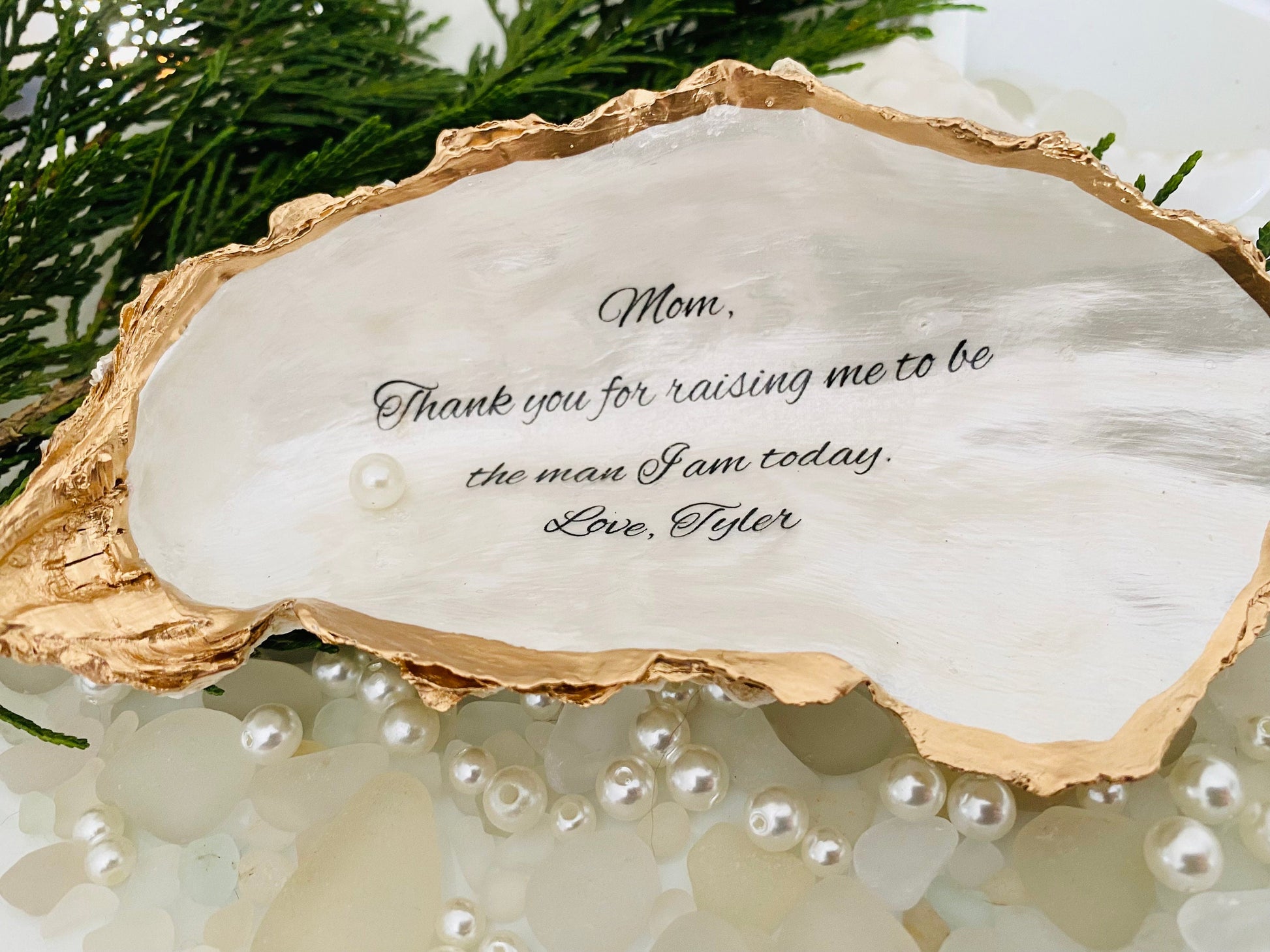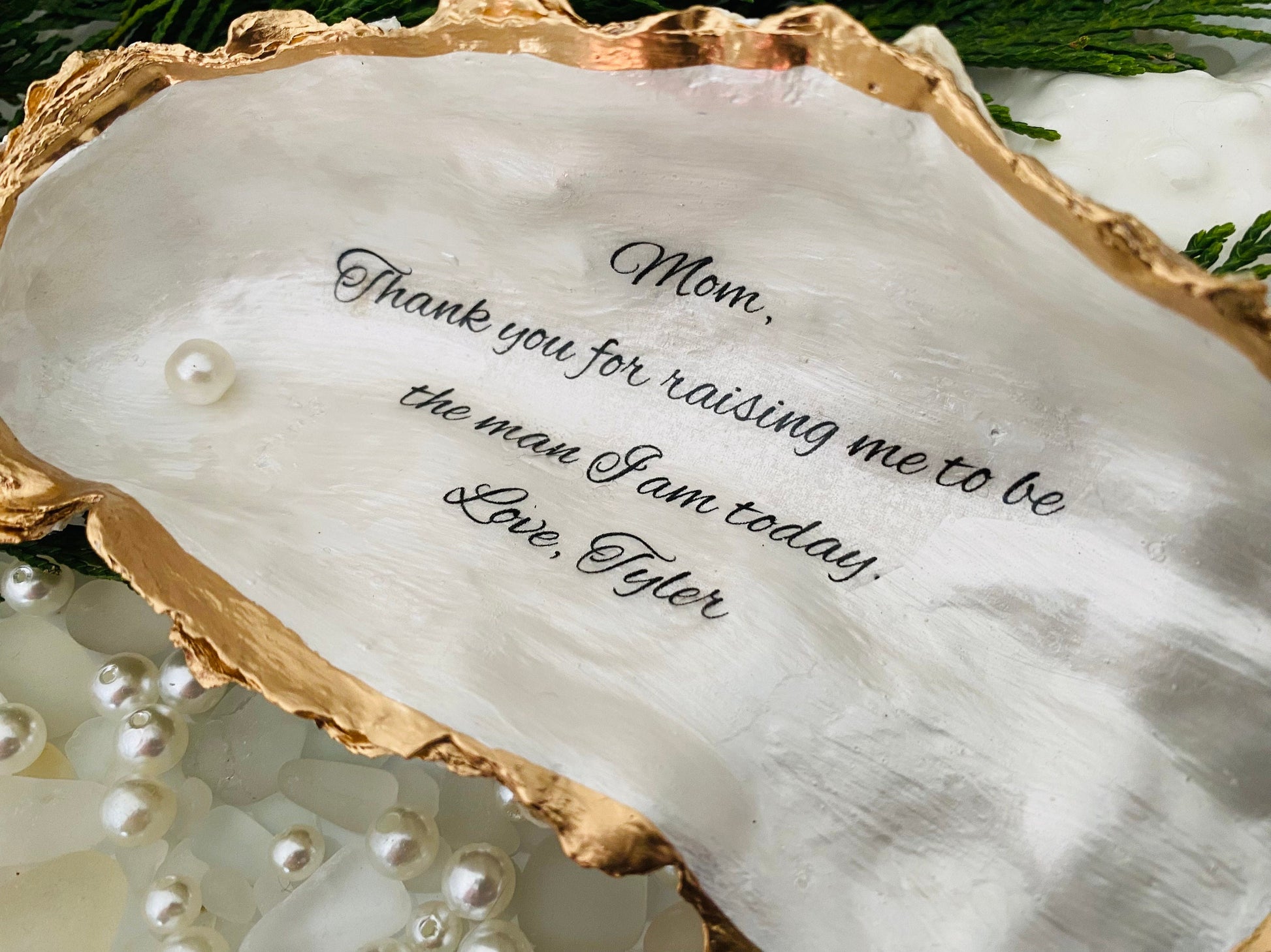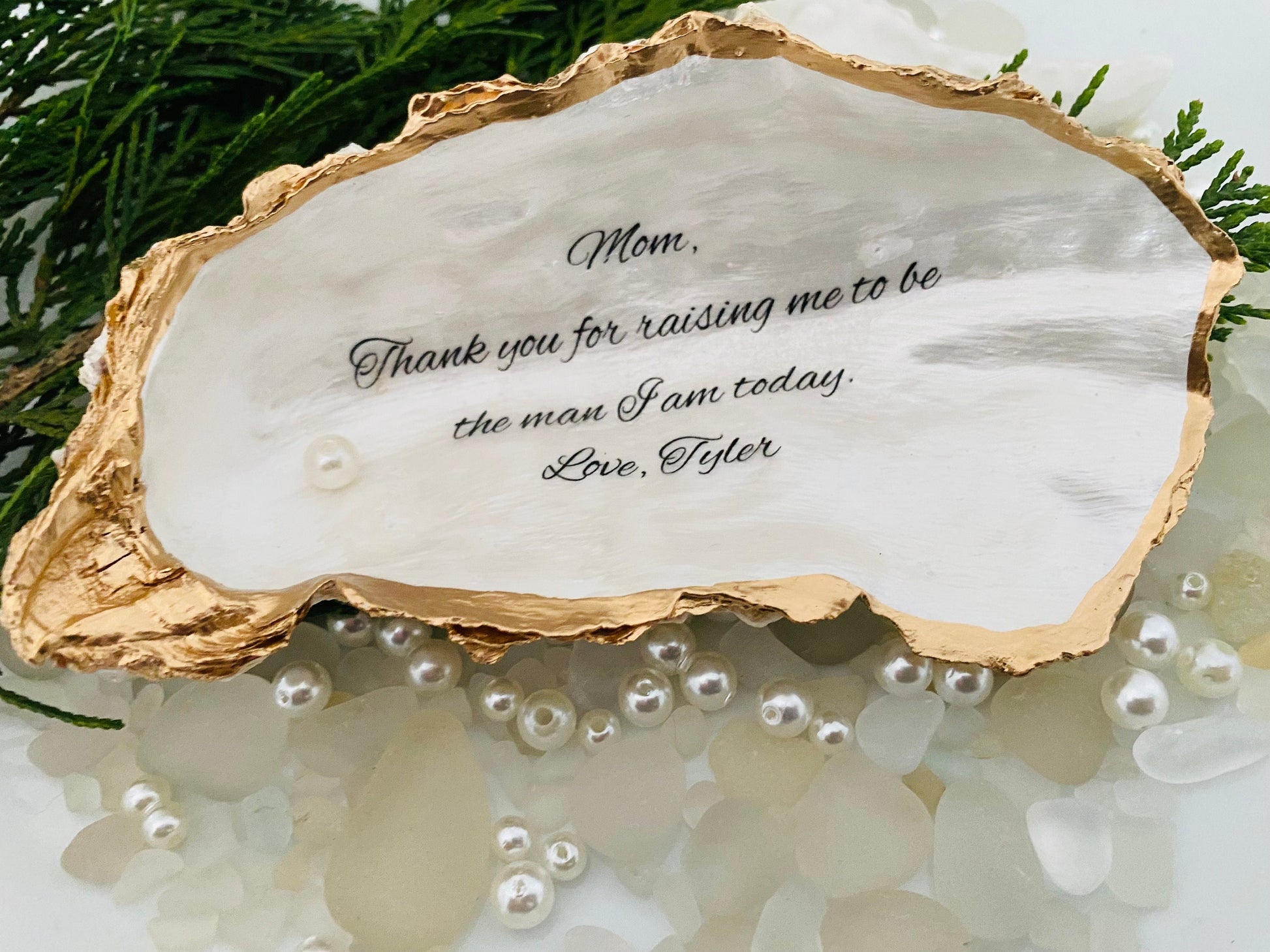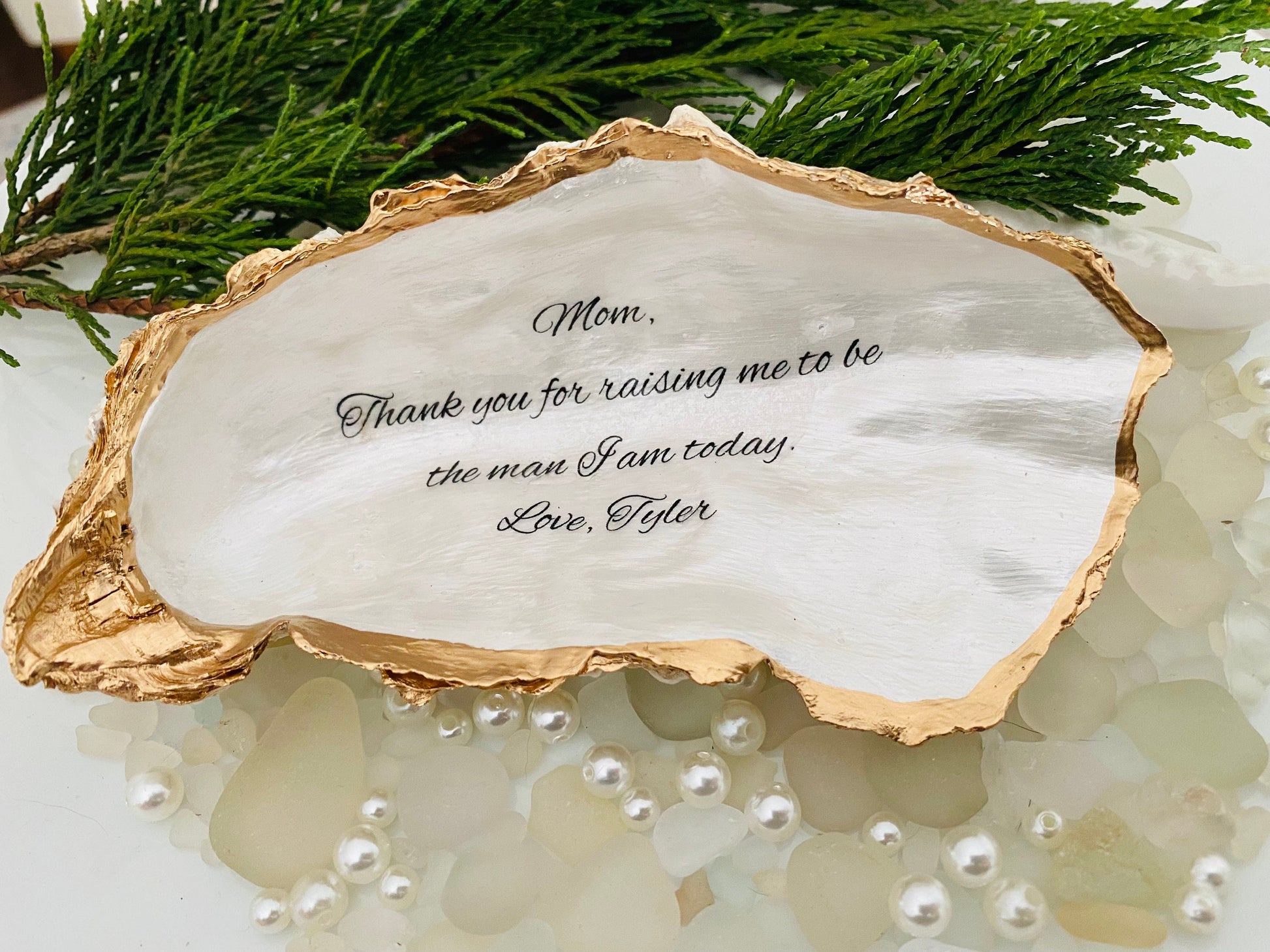 These exquisite "Thank You for Raising Me to Be the Man I Am" oyster ring/trinket dishes are perfect for holding rings by the kitchen sink or nightstand, or they can be displayed as stunning home decor and functional art. It’s the ideal gift for someone who seemingly has everything!
