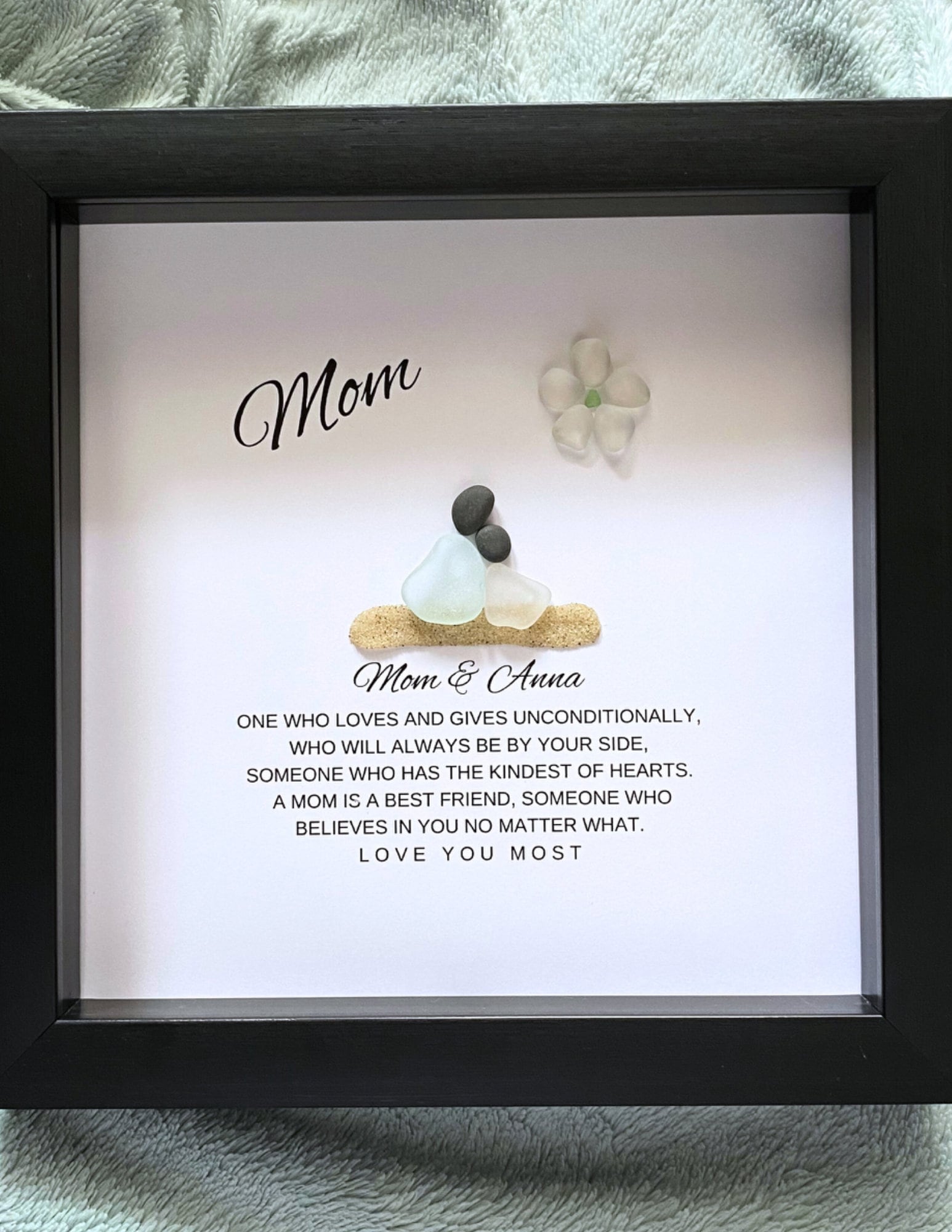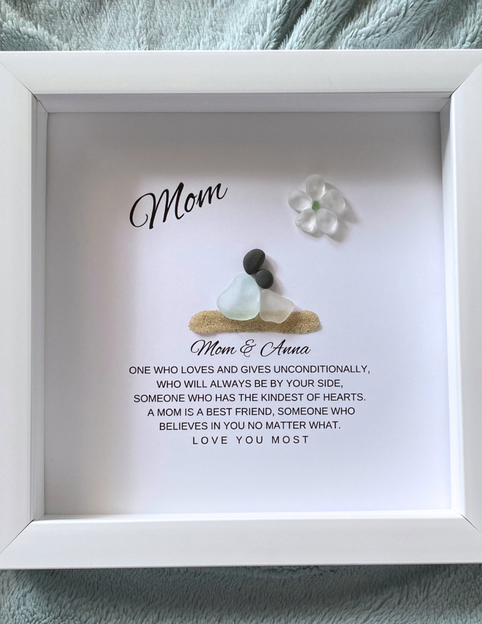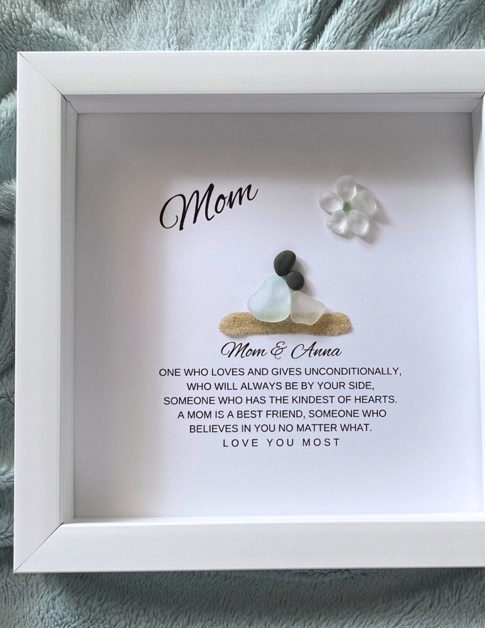 Discover the perfect personalized gift for moms with our beautifully handcrafted framed sea glass and pebble art. This unique Mother’s Day, birthday, or Christmas gift is an ideal way to celebrate the special bond between mothers and daughters, offering a heartfelt expression of love and appreciation.