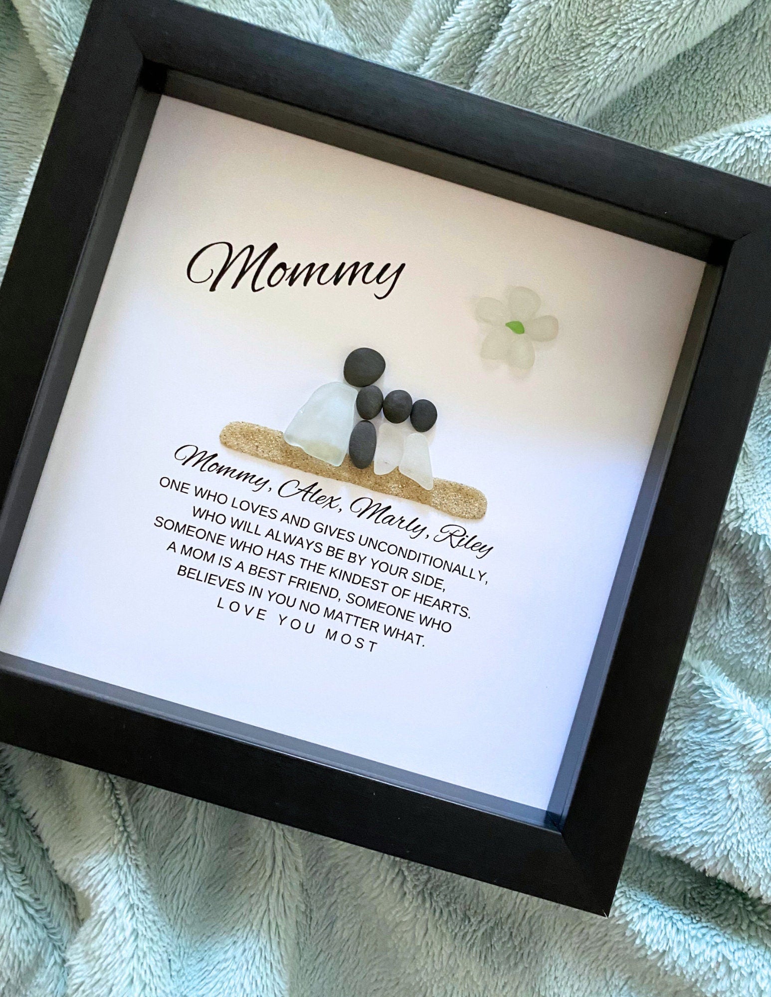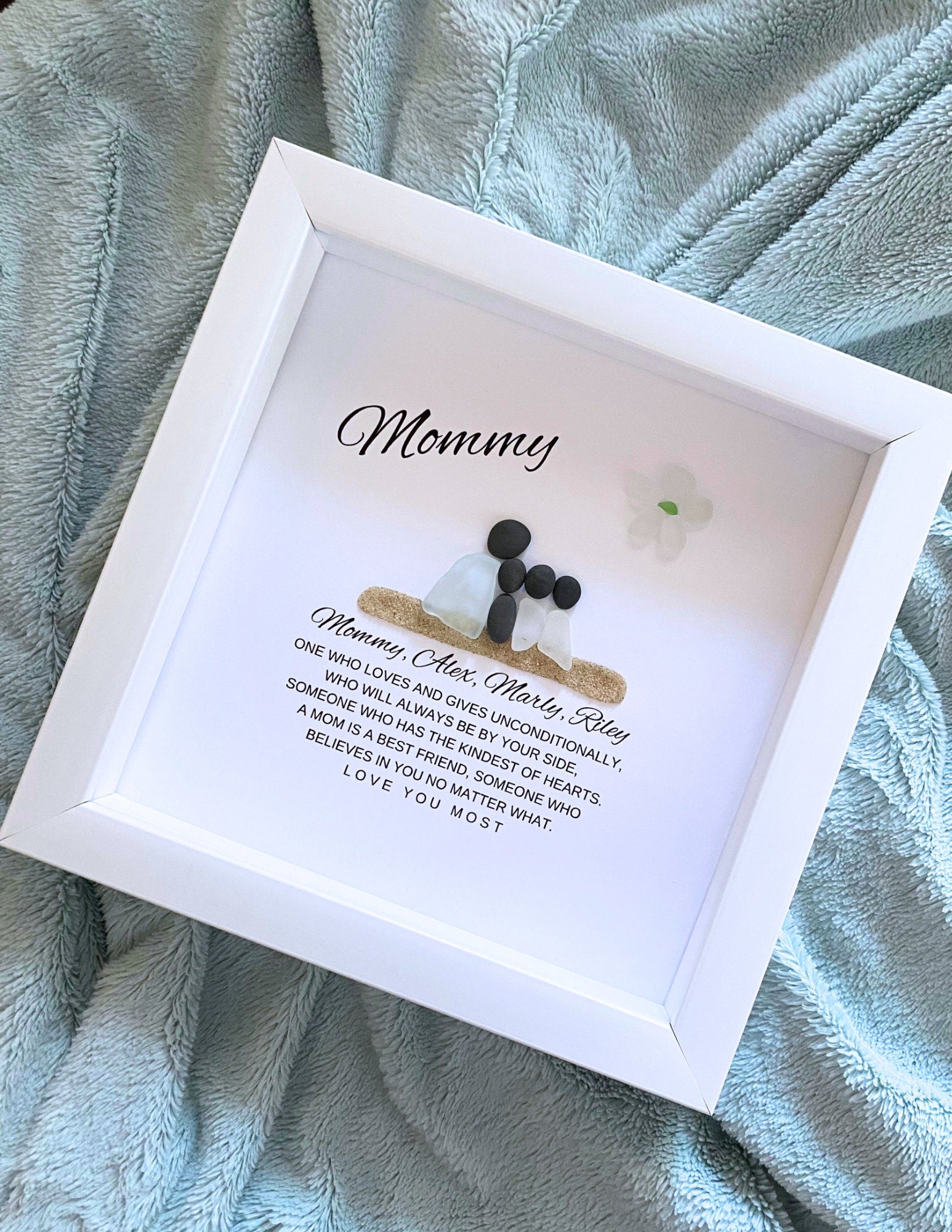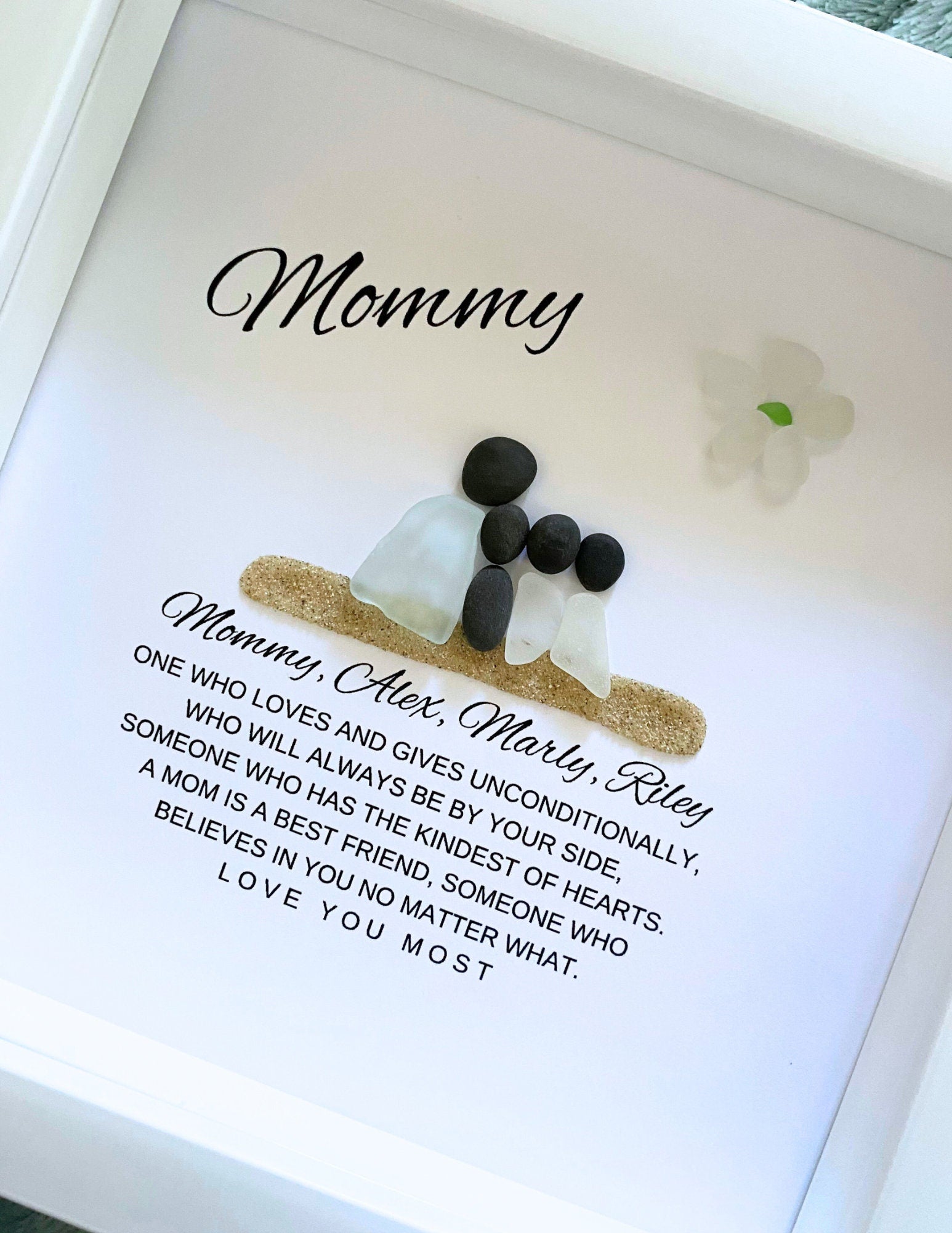 Looking for the perfect personalized Mommy gift? Our handcrafted sea glass and pebble art is an ideal choice for Mother’s Day, Christmas, or birthdays. This unique gift from daughters beautifully celebrates the special bond between mothers and children, making it a cherished keepsake for years to come.