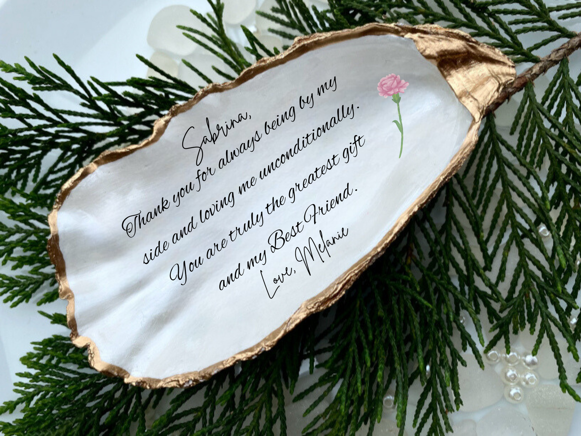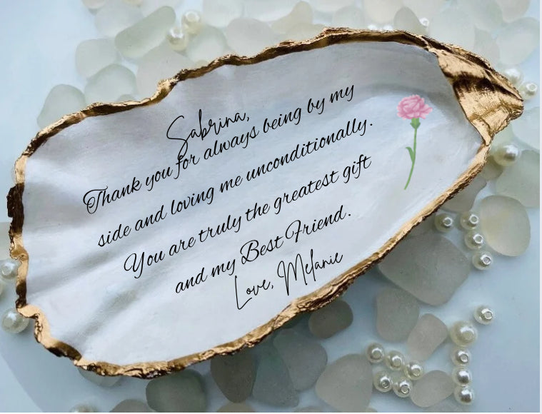 Surprise your best friend with a unique, handcrafted oyster shell ring dish, featuring a beautiful pearl-painted finish and elegant gold leaf trim. This personalized keepsake is perfect for celebrating a friendship that’s like no other, with the option to add a custom quote or special date that’s meaningful to both of you. It’s gift-boxed and ready to bring a smile, whether it’s for a birthday, special celebration, or simply because!