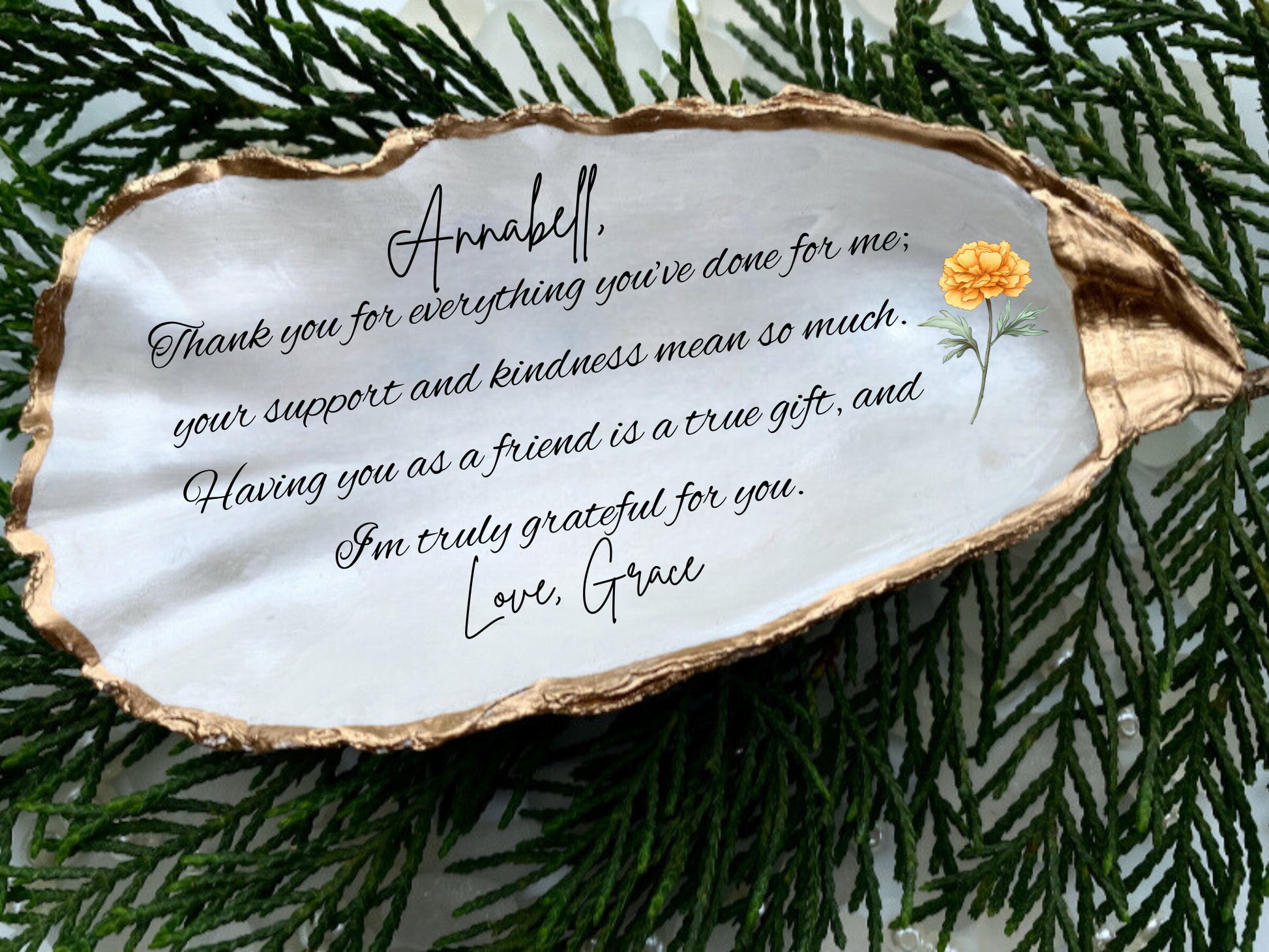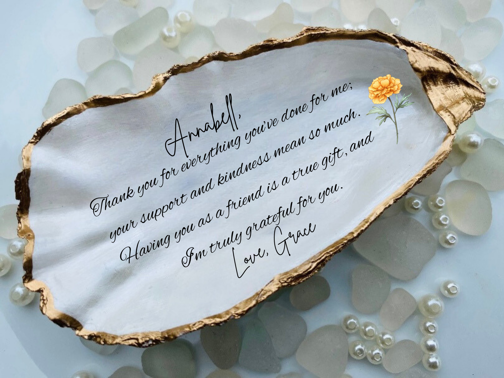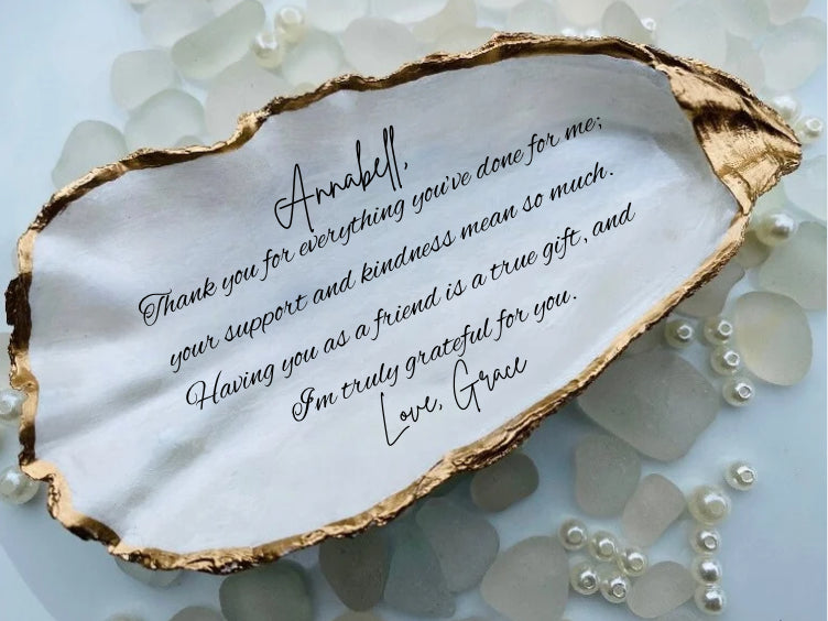A Unique, Handcrafted Gift for Your Cherished Friend. Surprise your wonderful friend with a unique, handcrafted oyster shell ring dish, perfect for Christmas, a birthday, or any special occasion. Featuring a beautiful pearl-painted finish and elegant gold leaf trim, this one-of-a-kind jewelry dish is a meaningful, personalized keepsake that celebrates the special friendship you share. Each ring dish can be customized with a heartfelt quote or memorable date, creating a truly thoughtful gift that reflects the cherished memories between you. Carefully gift-boxed and ready to bring a smile, this handmade treasure is a beautiful way to show your friend just how much they mean to you.