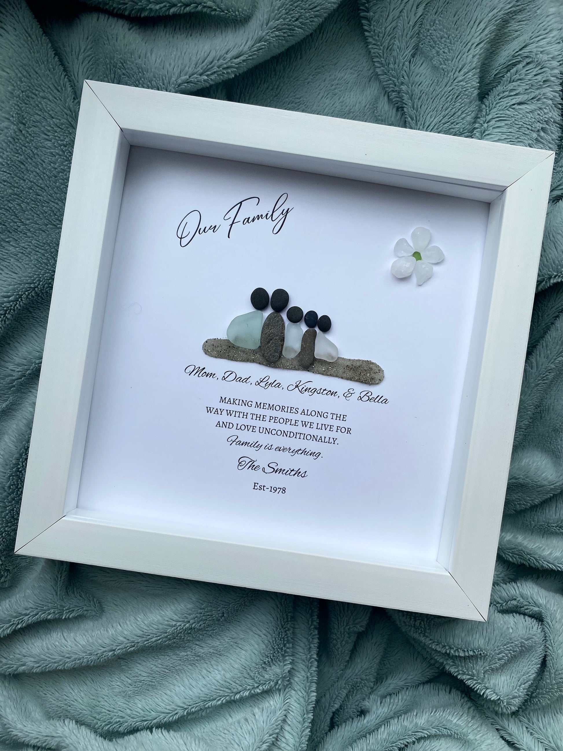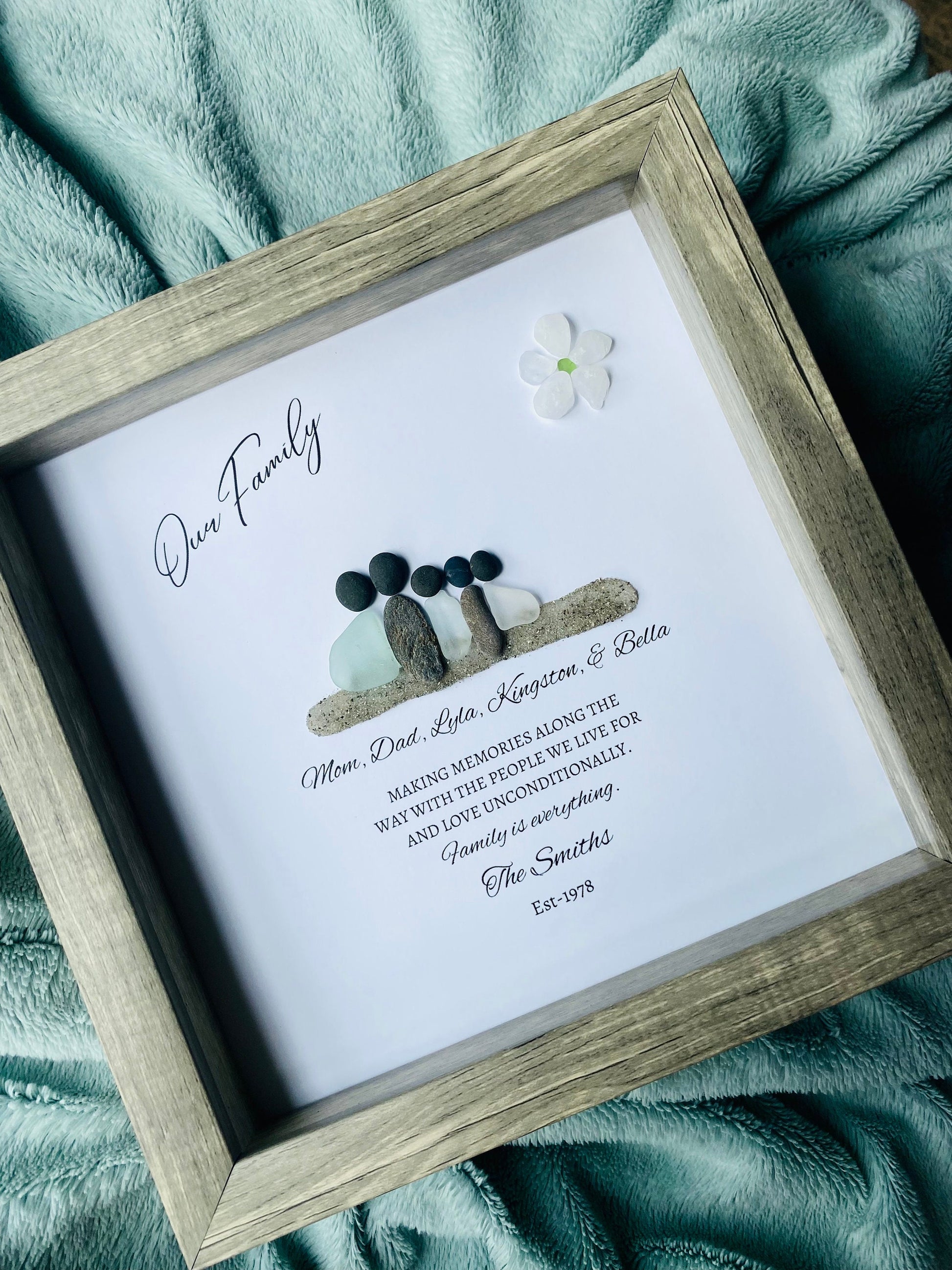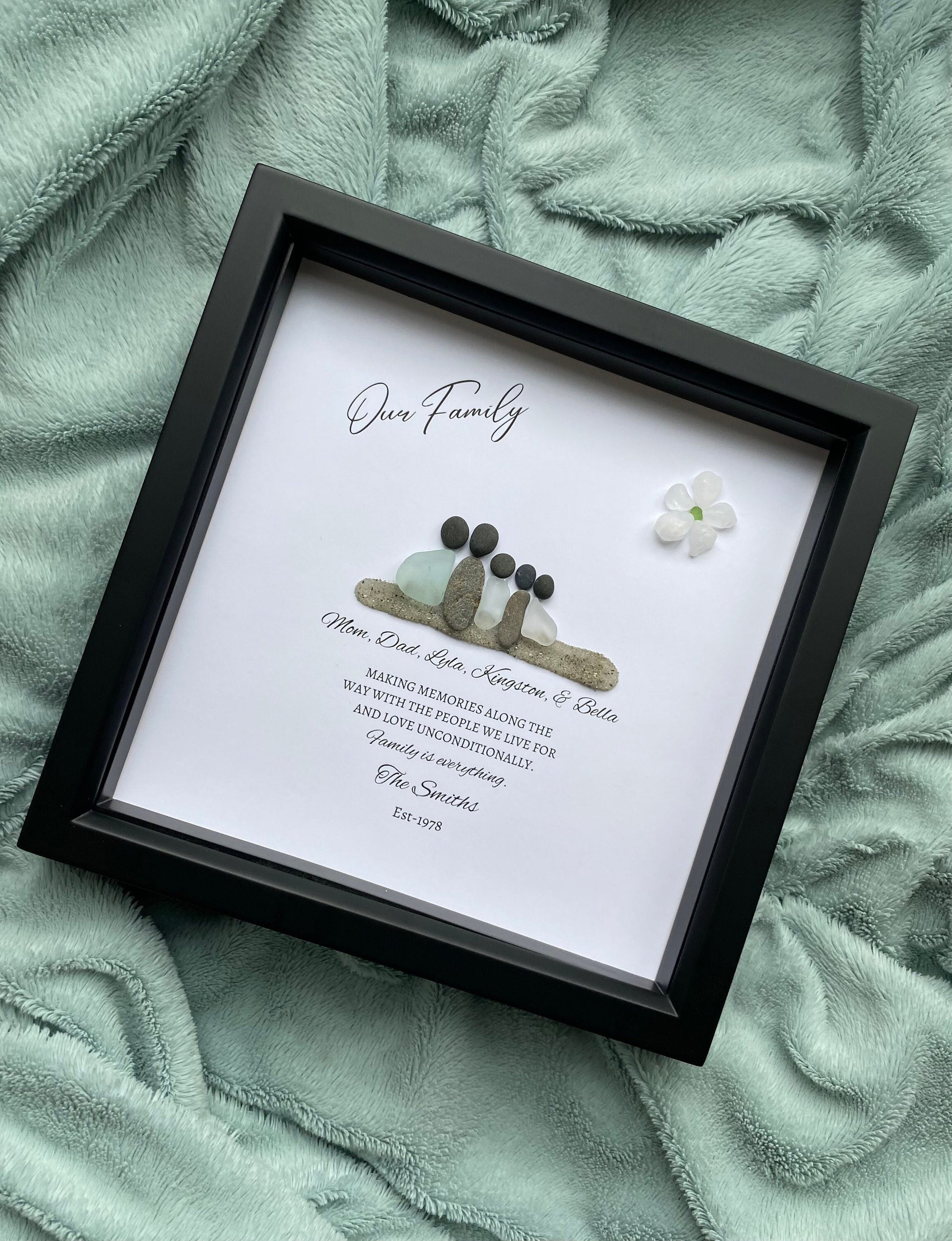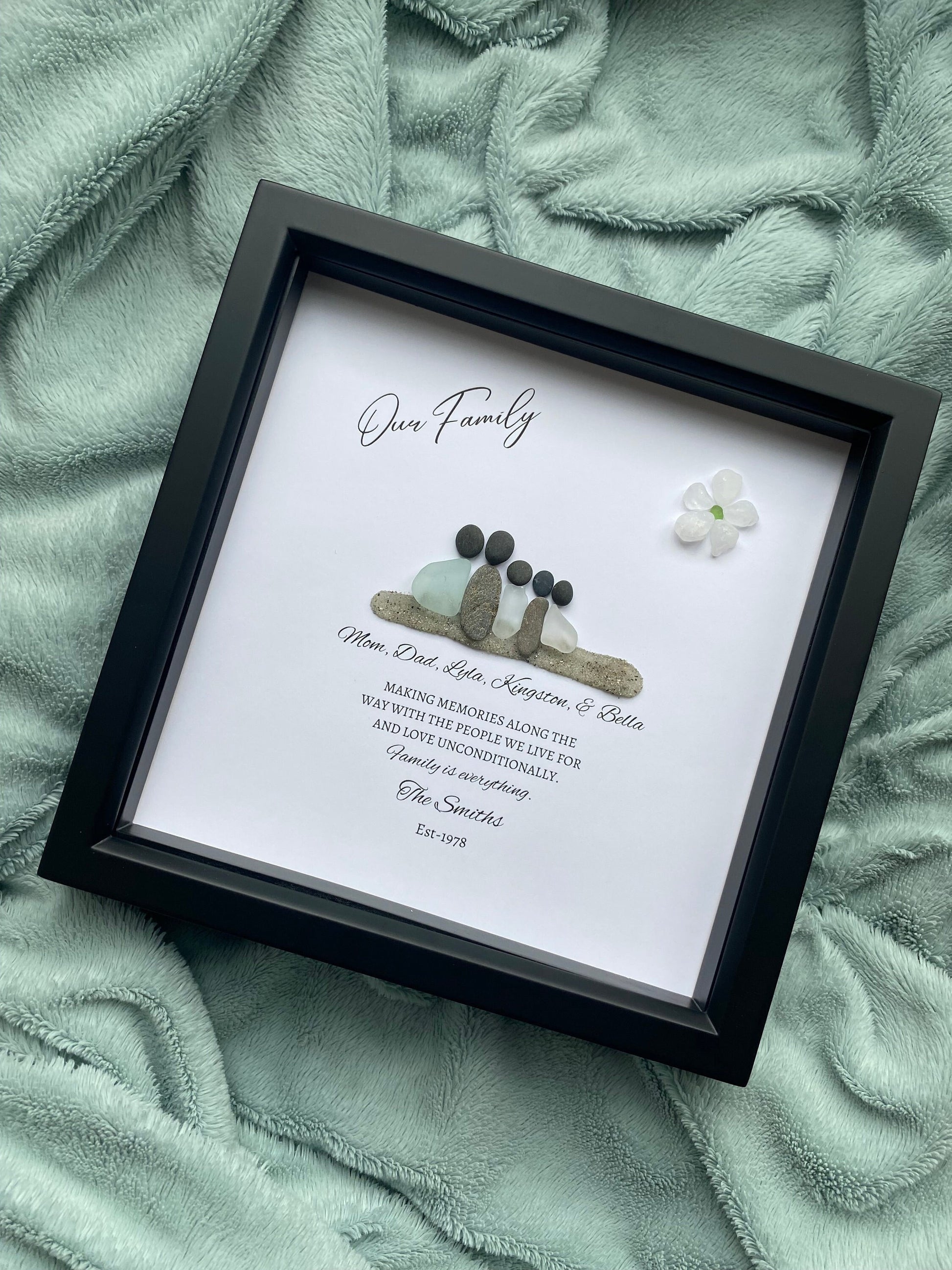 Introducing our beautifully handcrafted Family Sea Glass Pebble Art, a unique keepsake that makes the perfect gift for Father’s Day, birthdays, and Christmas. This personalized artwork beautifully captures your family’s essence, making it an ideal present for dads and grandfathers alike.