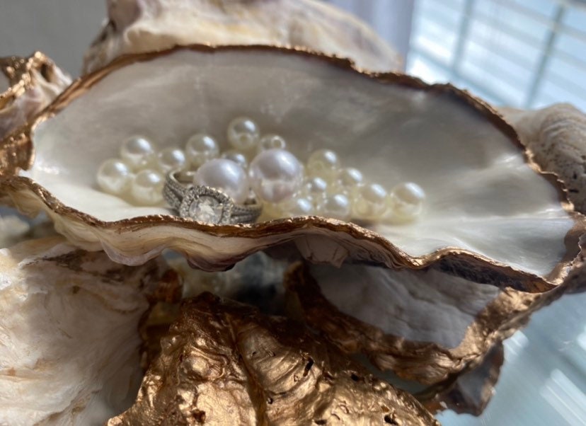 Discover the perfect blend of elegance and sentiment with our handcrafted oyster shell trinket dish. Each dish features a pearl paint finish inside, accented with a gold leaf trim and a custom quote. Ideal for weddings, bridal showers, or as a special engagement or anniversary gift, this personalized dish makes a meaningful keepsake that will always be cherished.