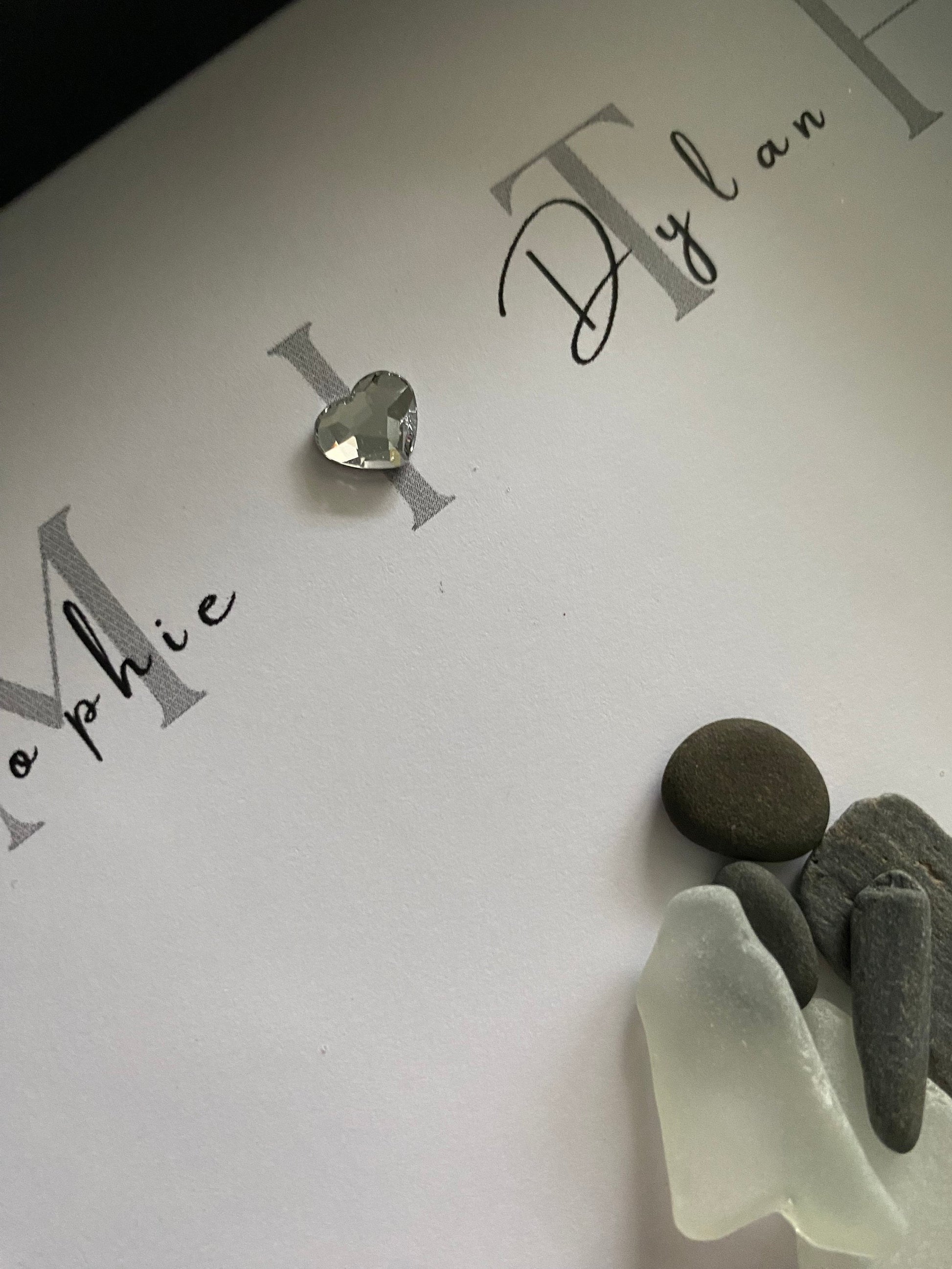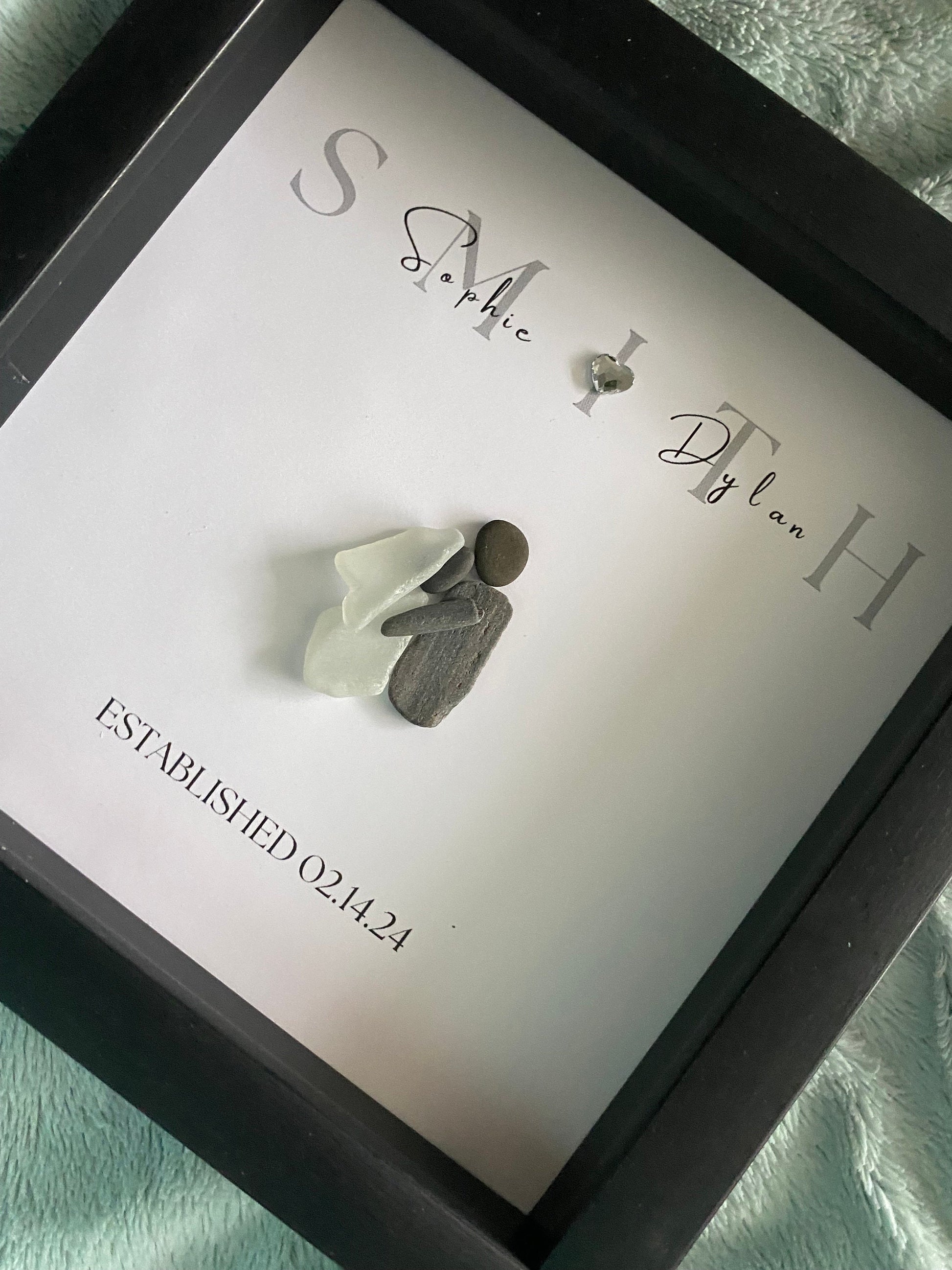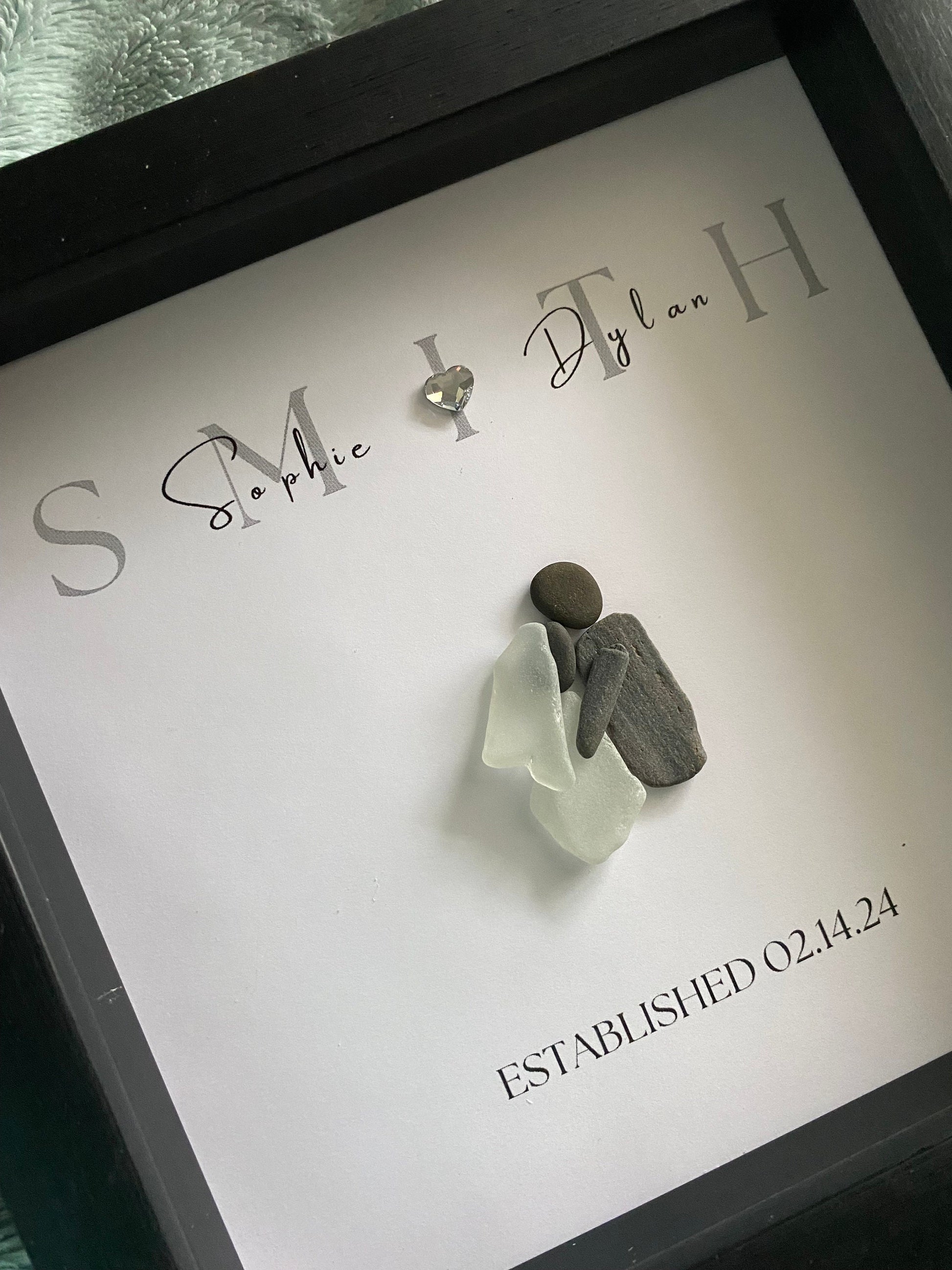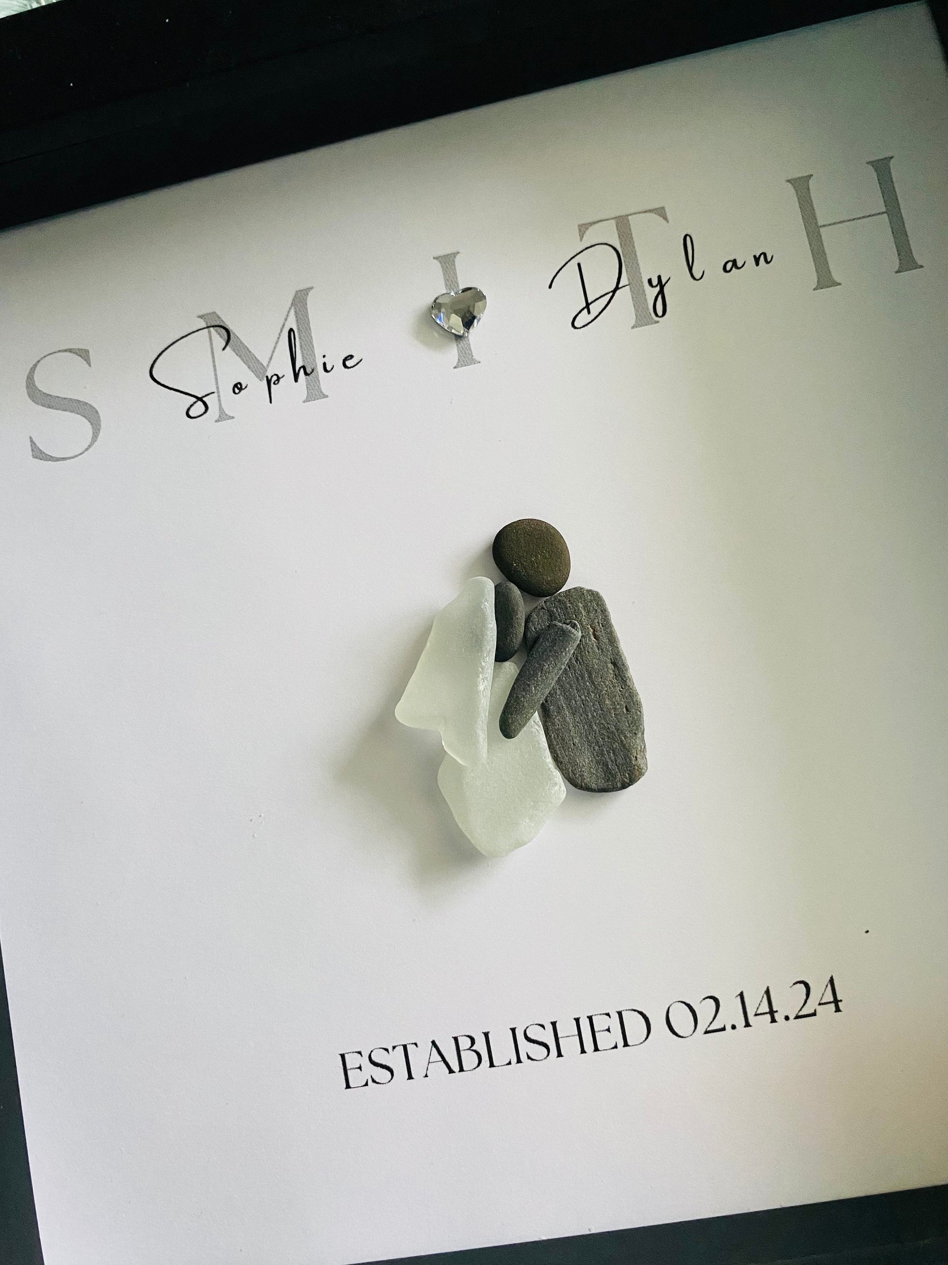 Celebrate love with our beautifully handmade, framed sea glass wall art, the perfect personalized wedding gift, anniversary gift, or engagement gift for couples. This unique coastal decor piece captures the essence of love and is a thoughtful addition to any home.