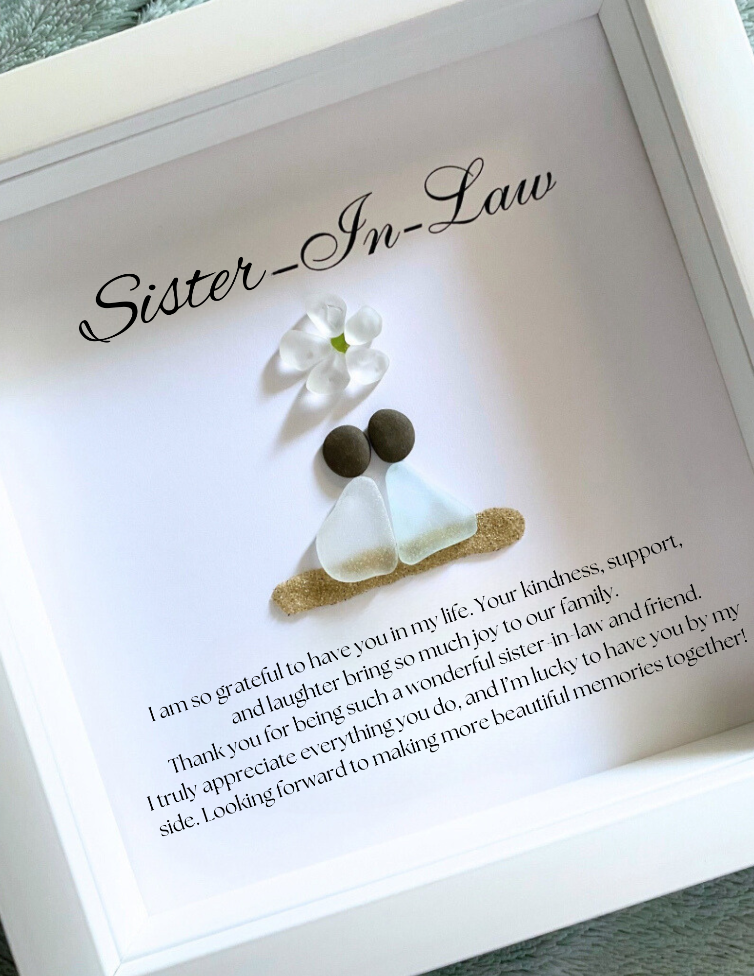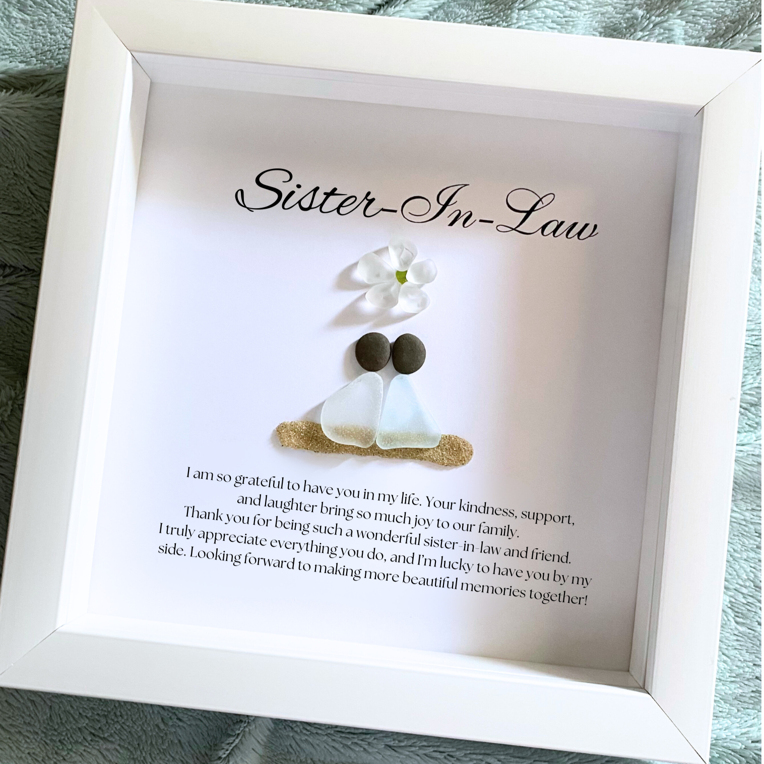 Discover the ideal personalized gift for your sister-in-law with our stunning framed sea glass and pebble art. Perfect for birthdays, Mother’s Day, Christmas, or as a heartfelt gesture on your wedding day, this unique keepsake beautifully celebrates your bond.