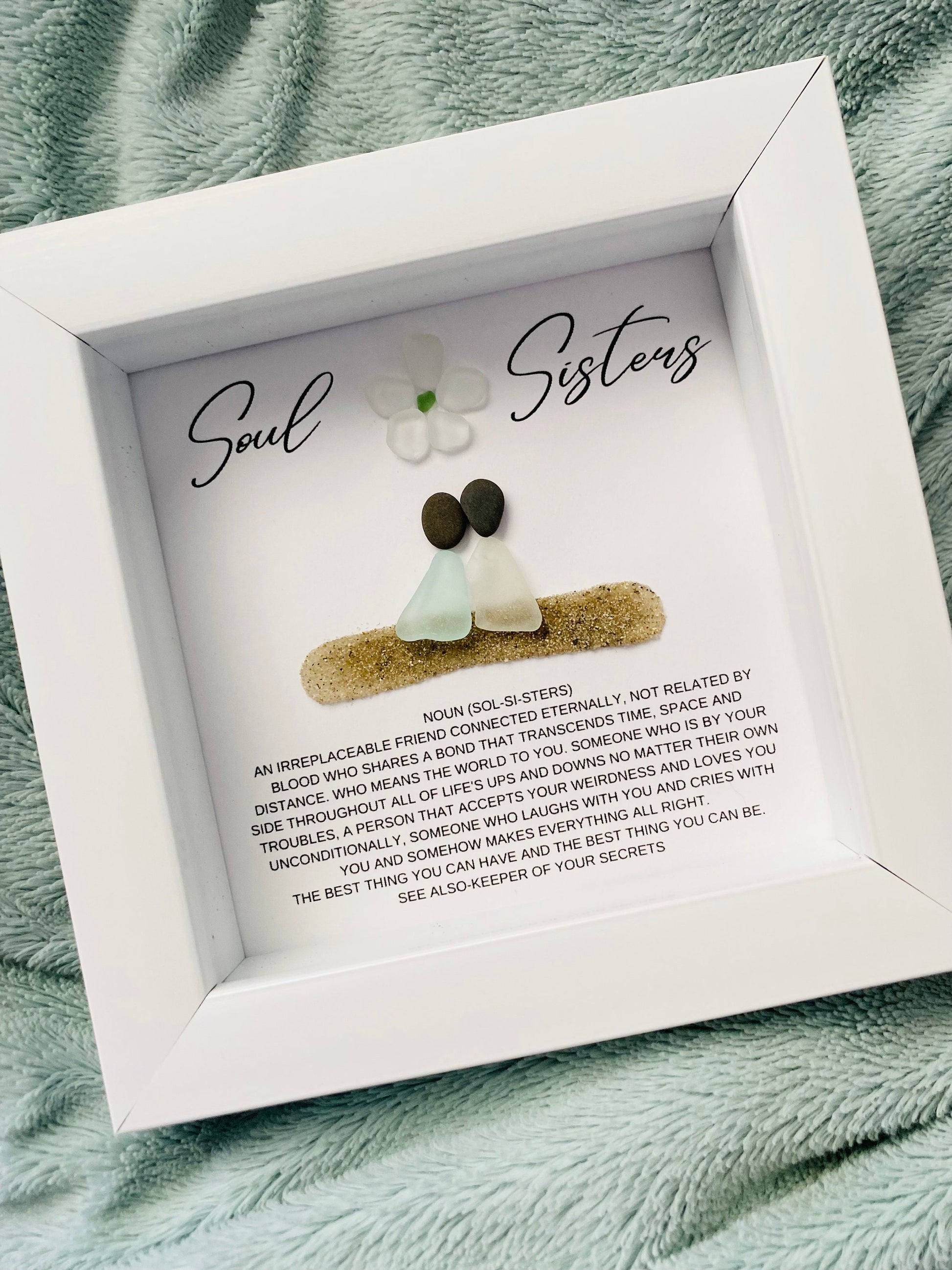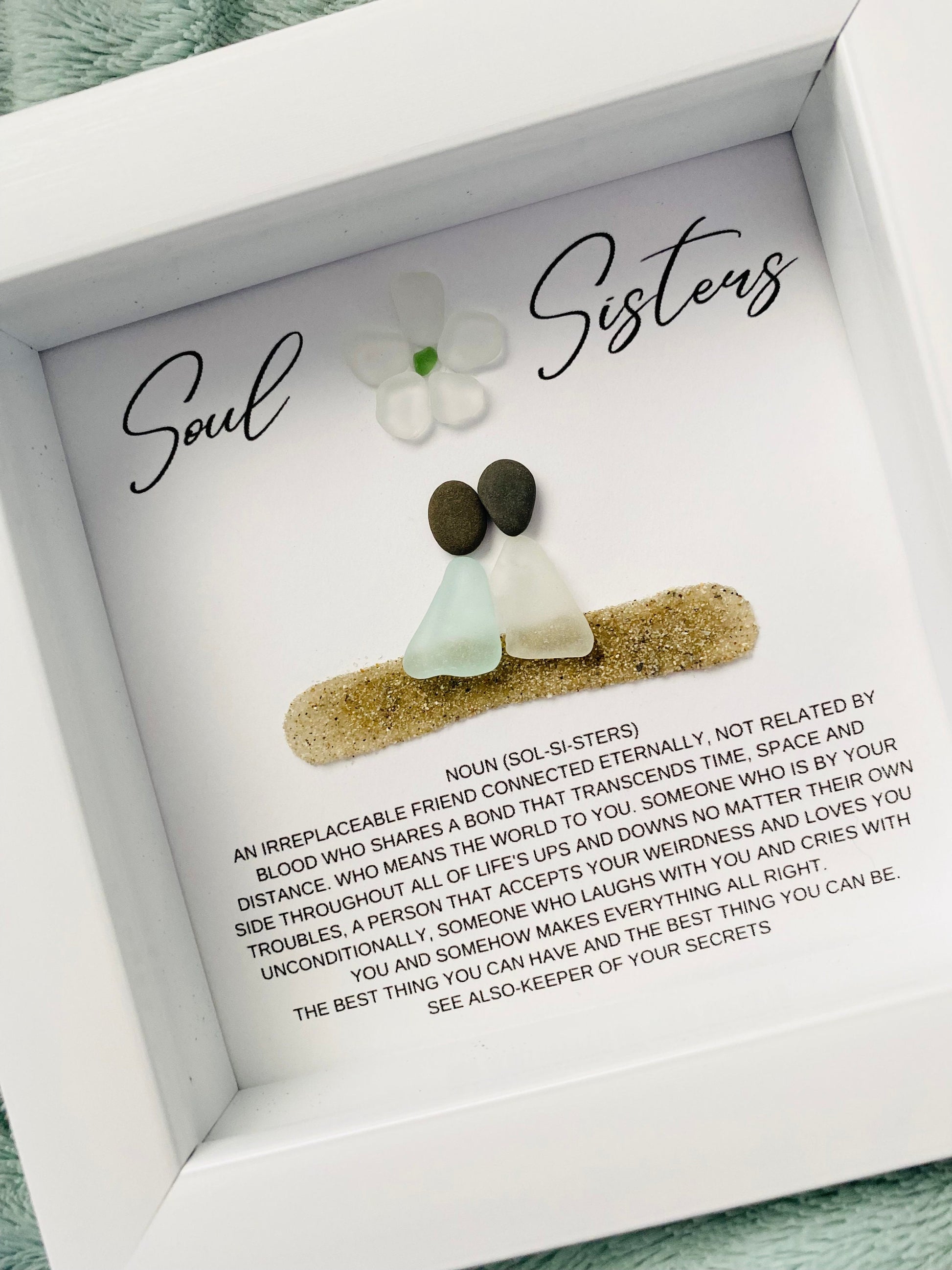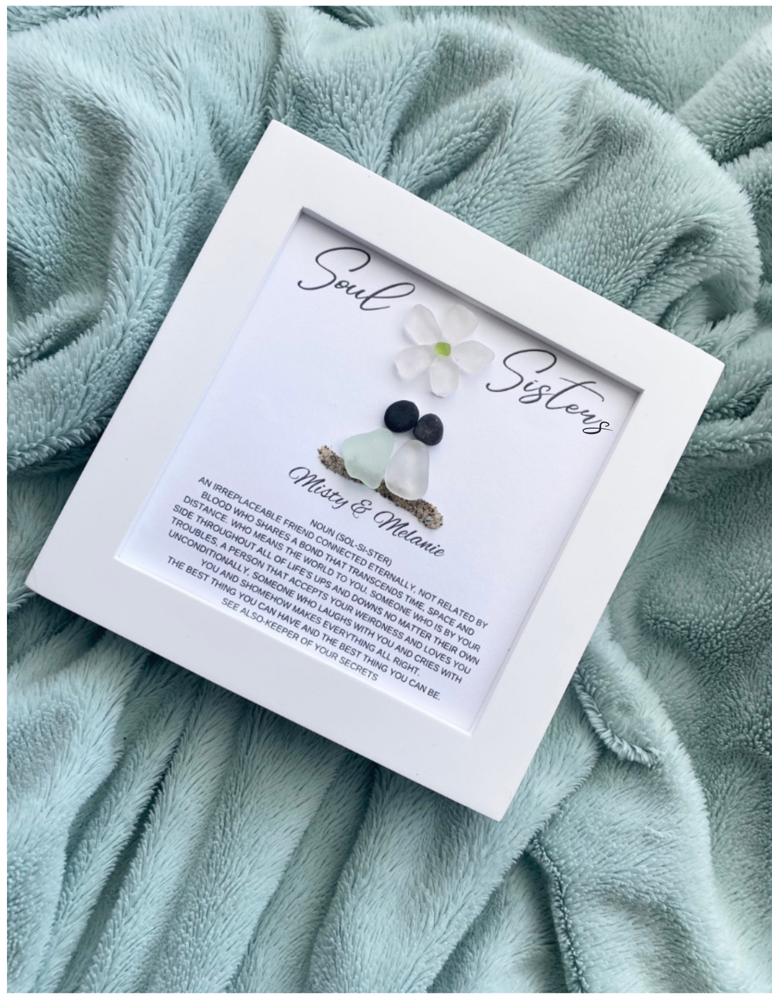Celebrate the bond of friendship with our beautifully personalized Soul Sisters gift, featuring handcrafted sea glass and pebble art. This unique piece makes an ideal birthday or Christmas gift for her, embodying the essence of sisterhood and friendship in a stunning display.
