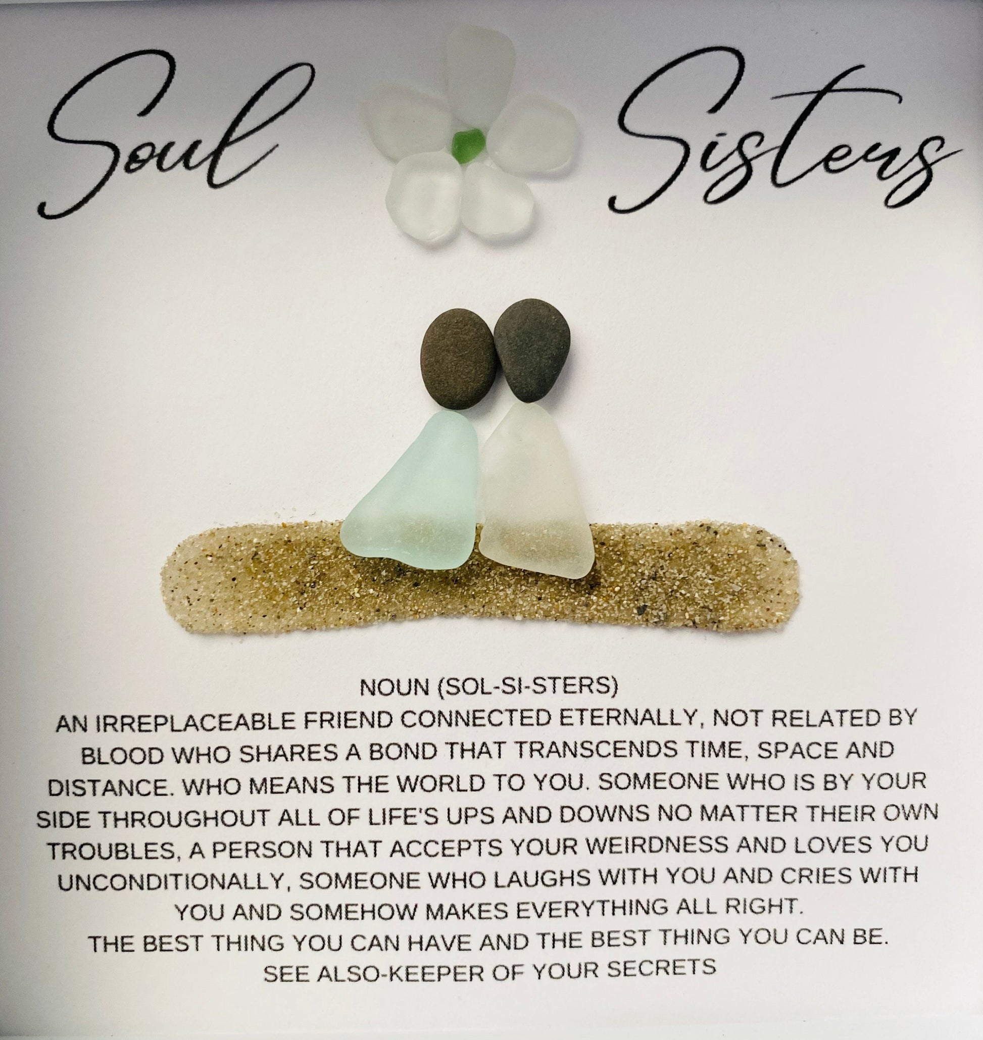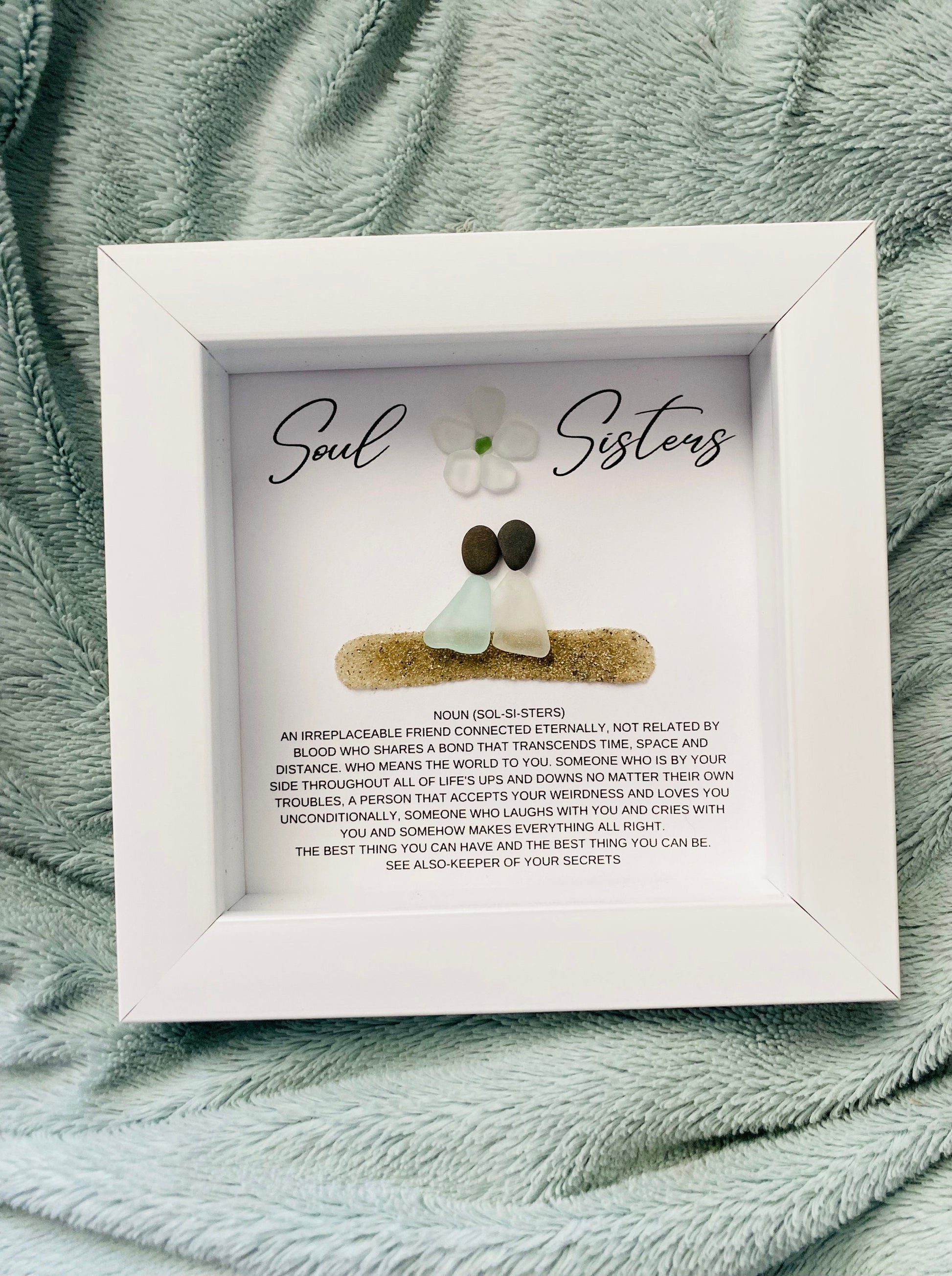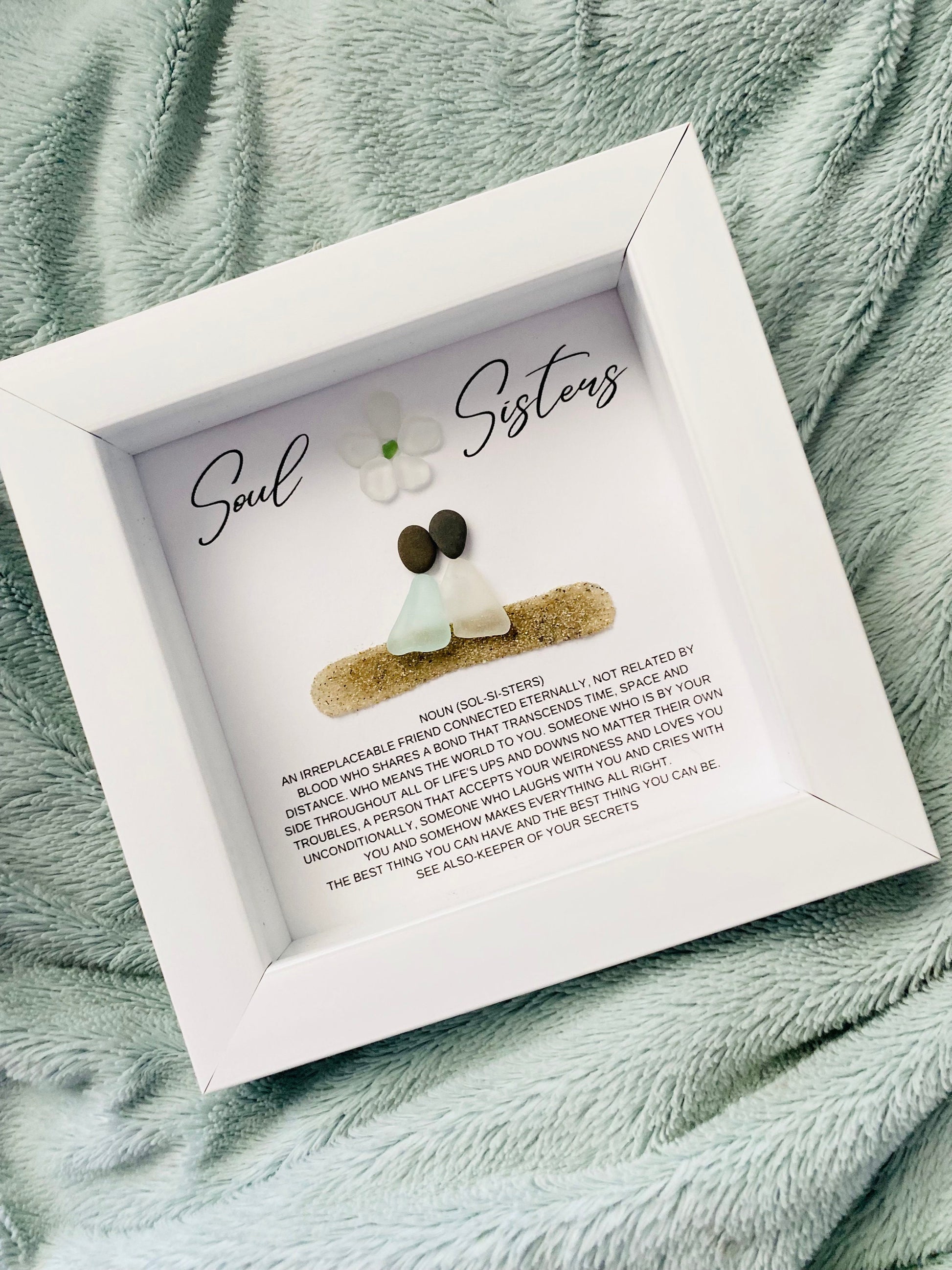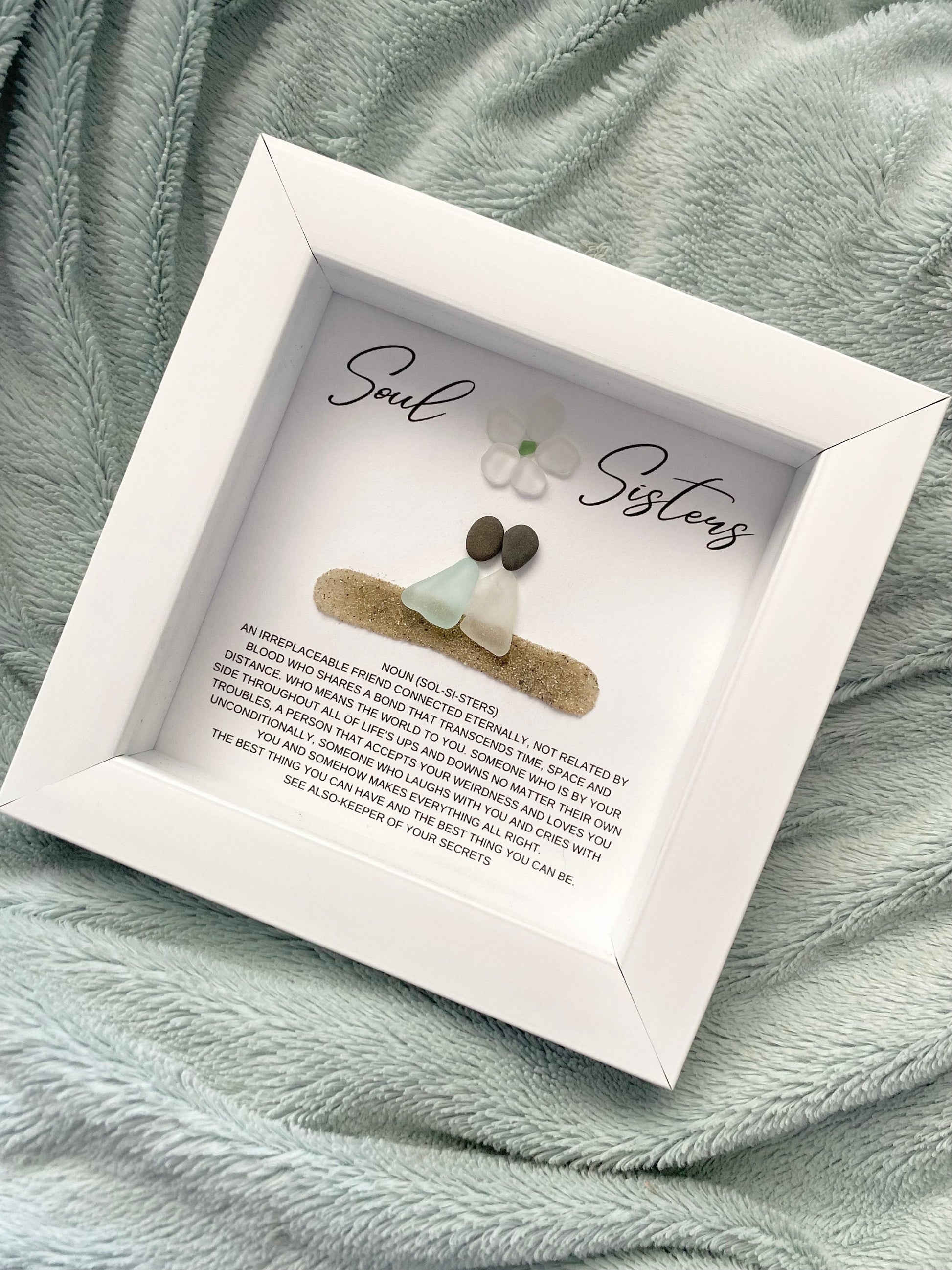 Celebrate the bond of friendship with our beautifully personalized Soul Sisters gift, featuring handcrafted sea glass and pebble art. This unique piece makes an ideal birthday or Christmas gift for her, embodying the essence of sisterhood and friendship in a stunning display.